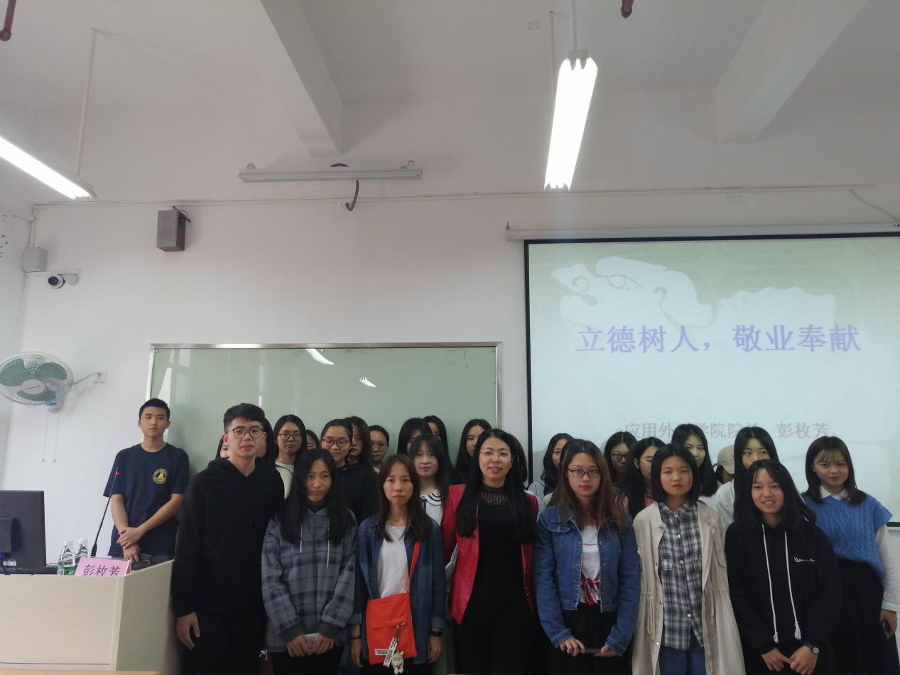 为响应广东省教育厅《关于做好2019年春季学期高校第一堂思想政治理论课工作的通知》,3月18日,由应用外语学院党总支副书记、院长彭枚芳主讲的思想政治理论第一课“立德树人,敬业奉献”在明德楼一区505正式开讲。全体积极分子及发展对象参加了此次学习。