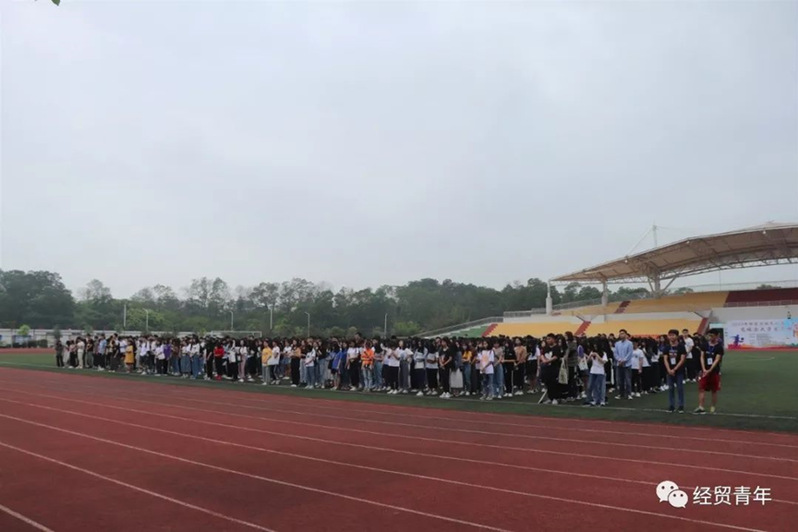 上午的田径场,经贸学院全体学生按照班级指定位置排成整齐的队伍。