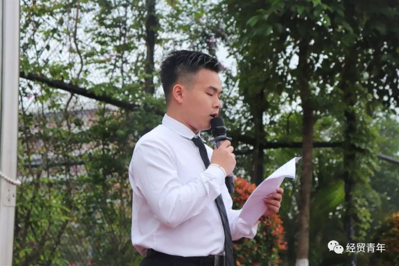 17电商2班黎梓健代表学生进行国旗下的演讲。他说:“青春一去不复返,所以要认准自己的目标;亦或许在青春追梦的道路上,不会一帆风顺,困难和挫折会是成长道路上的绊脚石,但是不管结果怎样,都要努力尝试,永不低头。”