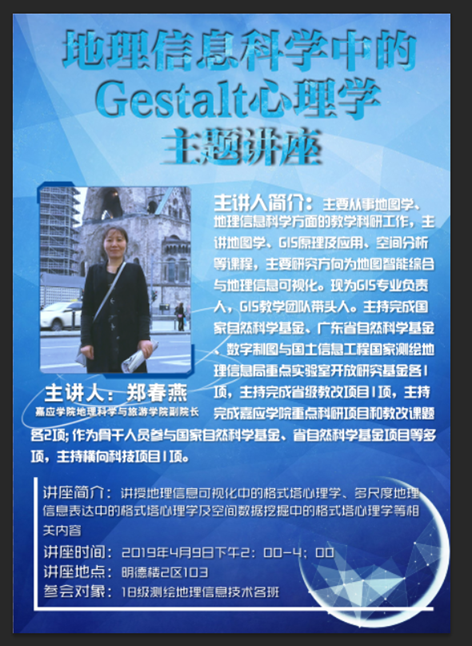 测绘遥感信息学院于2019年4月9日下午2:00在白云校区明德楼2区103教室,召开了“地理信息科学中的Gestalt心理学”专题讲座,嘉应学院地理科学与旅游学院副院长郑春燕为此次讲座主讲人、测绘遥感信息学院测绘地理信息技术专业教研室主任黄铁兰担任此次讲座主持、地信专业辅导员刘汝强带领测绘遥感信息学院18级测绘地理信息技术专业的学生聆听了此次讲座。郑副院长围绕地理信息可视化中的格式塔心理学、多尺度地理信息表达中的格式塔心理学及空间数据挖掘中的格式塔心理学等相关内容进行了讲演,郑副院长的个人魅力深深地折服了在场的每位同学。