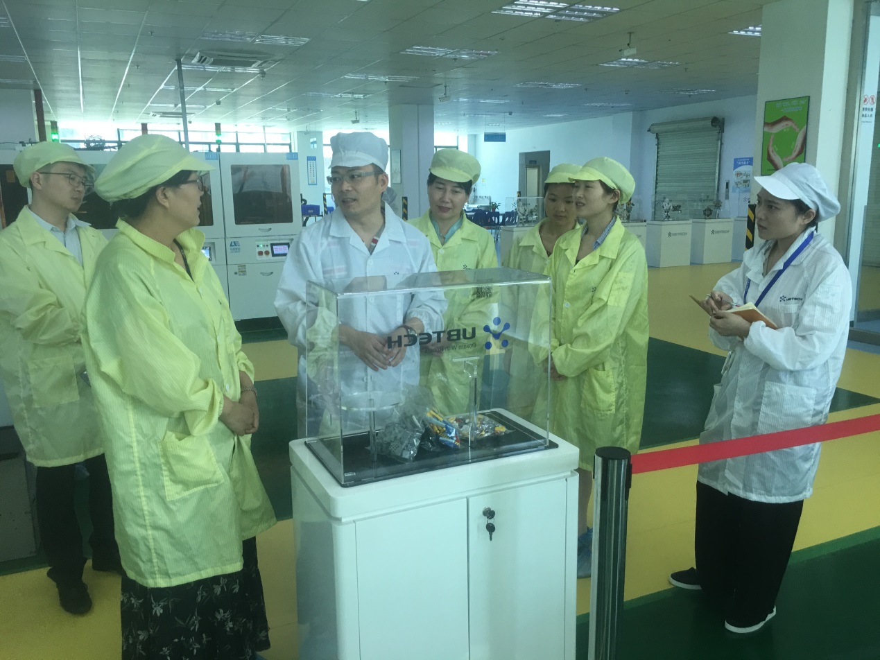 5月16日上午,王艳芬带领队伍参观了深圳市优必选科技有限公司位于龙岗的生产基地,该生产基地是深圳市优必选科技有限公司大型生产基地之一,主要生产jimu机器人以及Alpha机器人。在生产主管的陪同与讲解中,各位老师详细了解了人形机器人的生产流程及工艺。