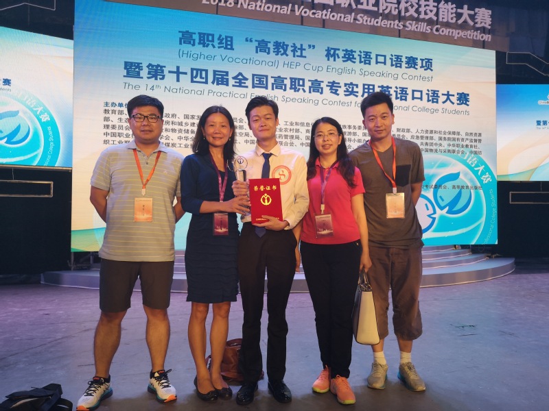 2018年6月13-15日,应用外语学院16商英1班竹宇同学(指导老师:肖铁蕾、钟文)在2018年全国职业院校技能大赛高职组英语口语赛项专业组荣获一等奖,并于同年7月13日签约深圳头狼电子商务有限公司,获30万创业基金,目前为该公司新媒体事业部小组负责人。2019年5月29日-31日,应用外语学院17商英2班陈俏倪(指导老师:陈亚东、周洵)在2019年全国职业院校技能大赛高职组英语口语赛项专业组荣获三等奖,该同学还成功专插本至肇庆学院英语(师范)专业。