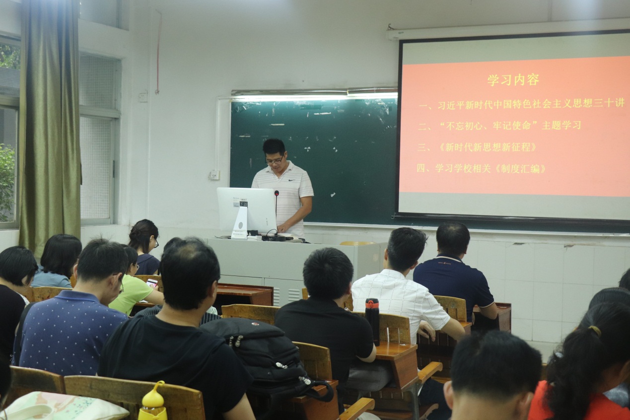 6月11日下午,计算机与信息工程学院在教学楼102召开“不忘初心、牢记使命”主题政治学习会议,全体教职工参加,会议由党总支书记张宁同志主持。会议开始,学工办主任代启兵老师组织大家学习《习近平新时代中国特色社会主义思想三十讲》中的第十七讲《加快建设社会主义法治国家》,紧接着是习近平总书记在 “不忘初心、牢记使命”主题教育工作会议上的重要讲话。大家表示,一定要自觉把思想统一到习近平总书记重要讲话精神上来,按照守初心、担使命、找差距、抓落实的总要求,为“师“为“范”,不忘初心,不忘信仰之心,对教育事业负责任。会上,大家还学习了《新时代 新思想 新征程》以及学校的相关制度汇编。