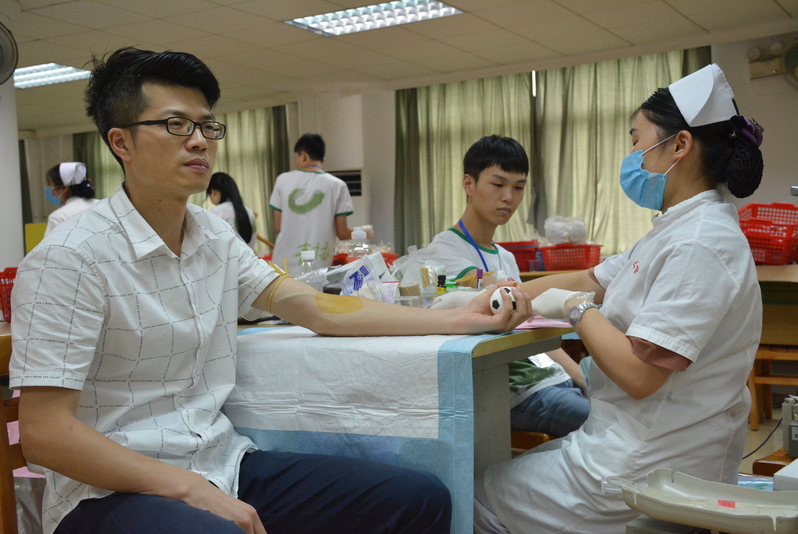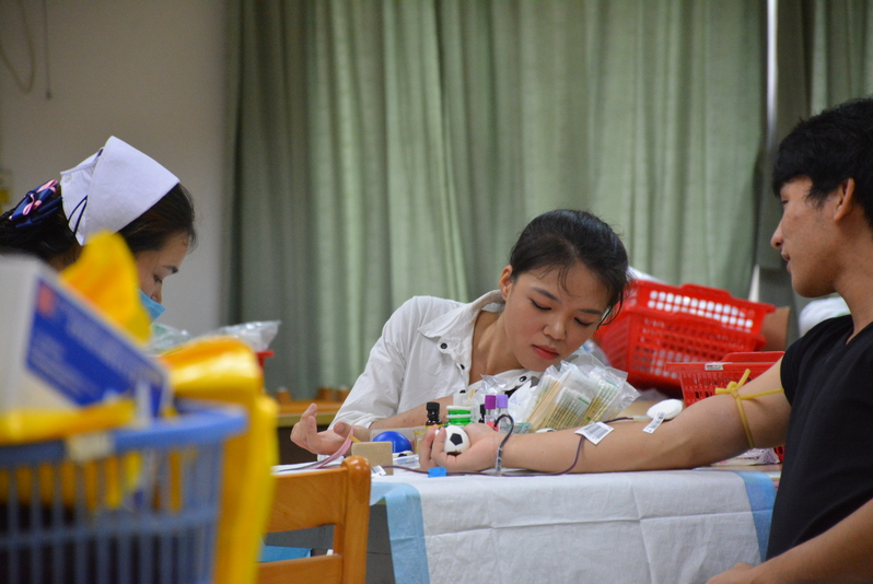 有些同学以前献过血,所以对献血流程很熟悉,不需要志愿者多做介绍;而有些同学是第一次献血,志愿者们就耐心地向他们介绍献血的相关事项;有些同学献血的热情很高,却因为不符合献血条件失望而归。下午4点半,献血人数逐渐减少,虽然不及刚才的热闹场面,但依然陆陆续续地有同学来献血。