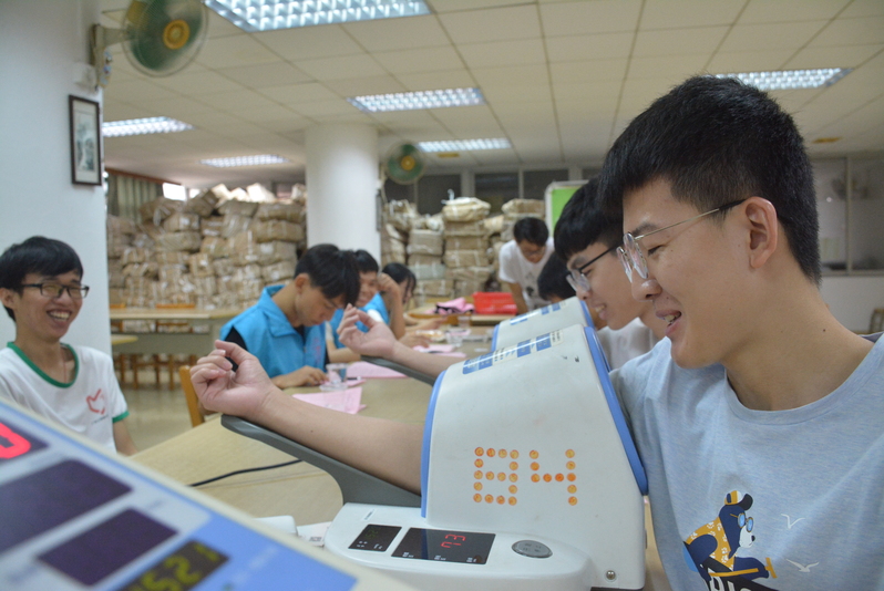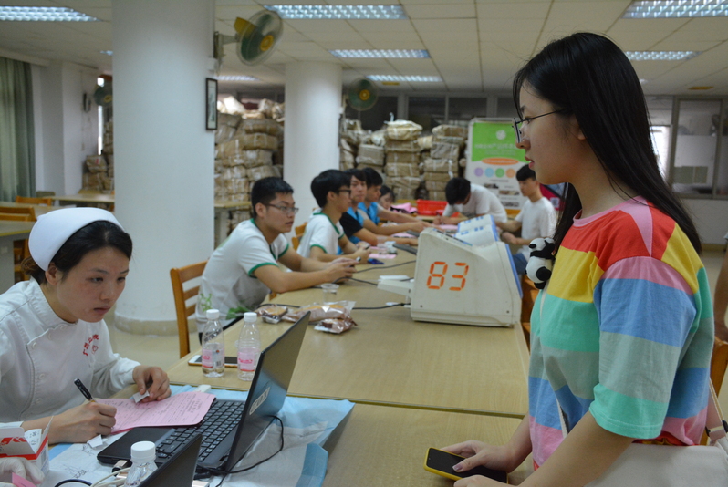 刚开始,人流量并不算大。随着时间的推移,献血的同学越来越多,在医护工作人员和志愿者们的协助下,填表、化验、等候、抽血、休息,一切工作都有条不紊。志愿者们忙着为献血者登记、指引,为献完血的同学供应糖水,以及发放献血证和礼品。