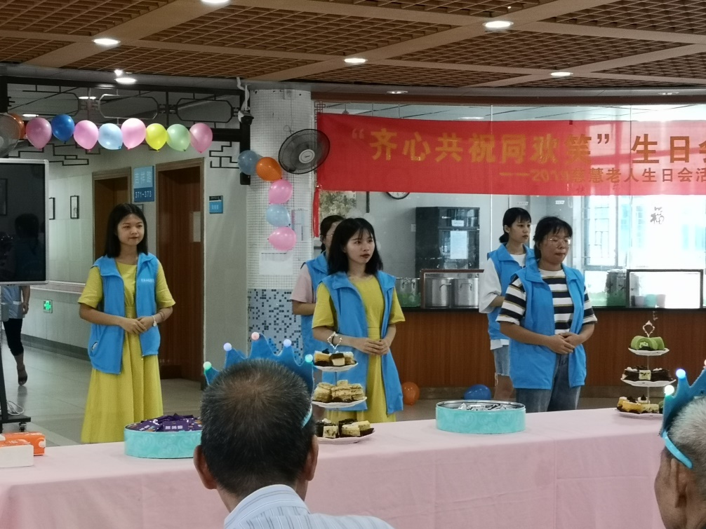 下午两点半,前期的准备工作完成之后, 2019年第二季度生日会正式开始了。首先,本次生日会主持人吴燕华同志的开幕词为生日会营造了热热闹闹的气氛;紧接着,园区叶主任上台致辞,她对志愿者们的到来表示欢迎和衷心的感谢,同时也祝福老寿星们生日快乐,祝福全体老人们身体健康,天天开心。