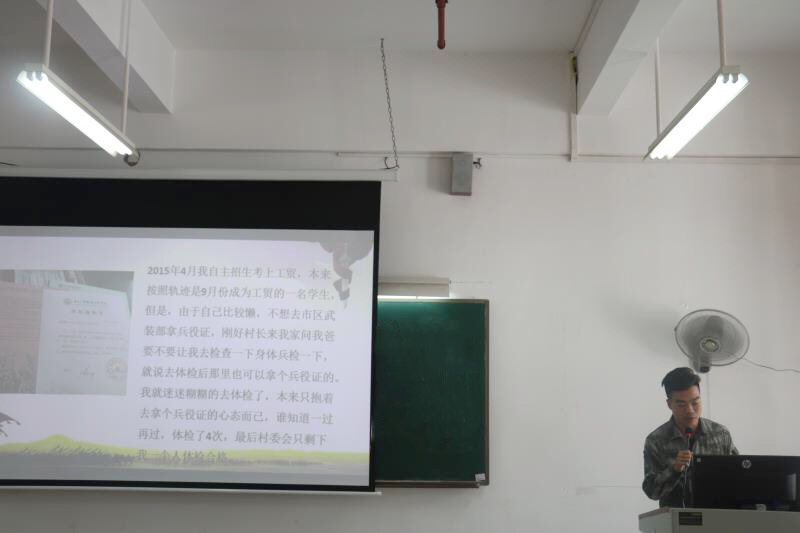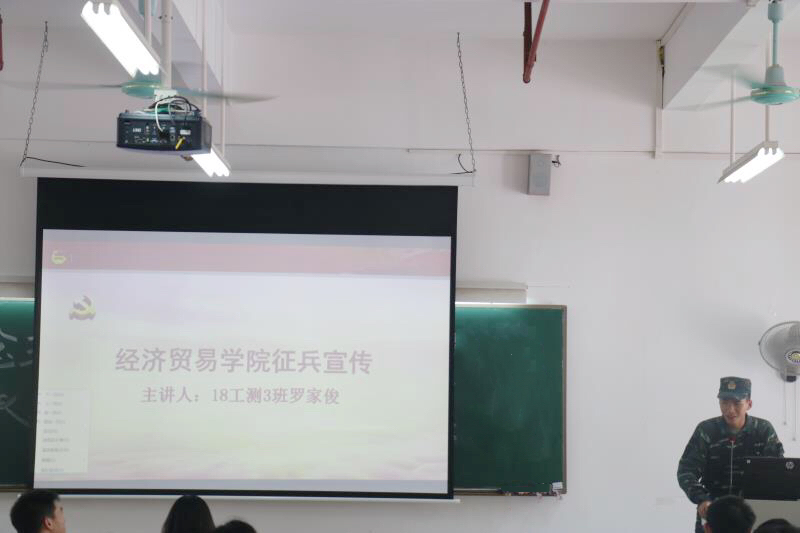 如果说人生是五彩缤纷的田野,那么青春就是其中最绚丽的一朵太阳花。在最值得尽情挥洒汗水,全力追逐梦想的青春时代,每一种奋斗的姿势都是青春花朵绽放的最美姿态。一千种青春,有一千种绽放姿态,在美丽的象牙塔时光里,除了在校园努力学习之外,还有没有别的选择,同样可以实现奋斗的青春梦呢?6月27日下午,经济贸易学院举行征兵宣传讲座,邀请了学校军事爱好者协会成员、来自测绘遥感信息工程学院的罗家俊、林智毅同学,来为大家讲述他们携笔从戎、报效祖国的别样青春故事。经贸学院学工办人员、各班级代表参加了本次讲座。