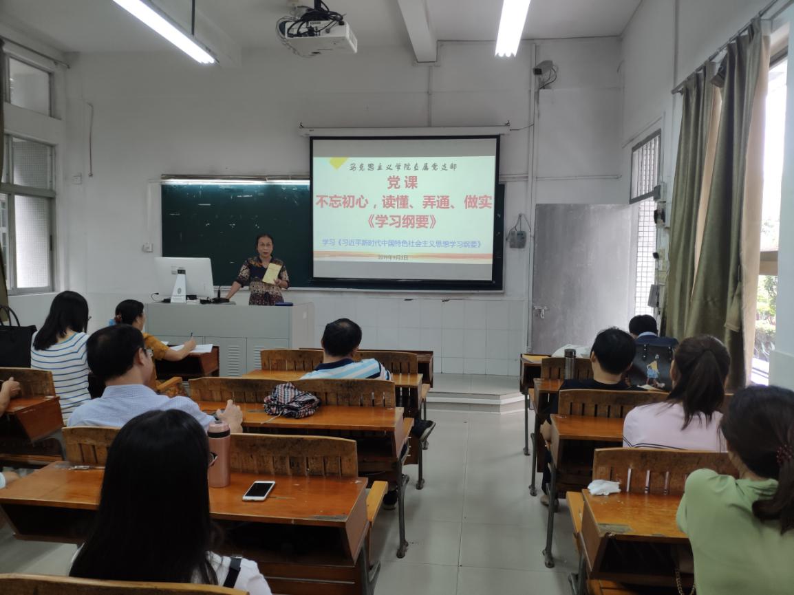 接着,由李瑞清带领大家开展了“不忘初心,读懂、弄通、做实《习近平新时代中国特色社会主义思想学习纲要》”专题党课学习。她介绍了《学习纲要》的主要内容和框架,从学术角度,对“纲要”的内涵进行深入浅出的解释,对“学习纲要”与党的十九大报告和“习近平谈治国理政”内在联系进行解读,认为其灵魂是一致的,都是习近平新时代中国特色社会主义思想。要求党员教师们认真学习《纲要》精神,用习近平新时代中国特色社会主义思想武装头脑、指导实践,不断提高自身的马克思主义理论水平,在思想上、政治上和行动上同党中央保持高度一致。