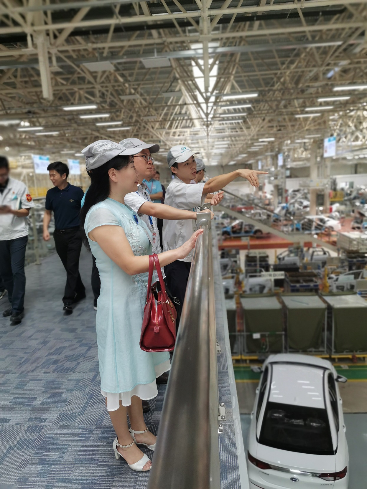 参观考察期间,在广汽研究院智能驾驶产品科齐新迎科长带领下,广东工贸职业教育集团一行参观广汽新能源智能工厂,齐新迎对工厂的智能机器人协同作业、数字化仿真技术、智能3D视觉系统、高速精准座椅装配工艺、轮胎智能装配系统、智能生产线、自动驾驶系统检测线及新能源汽车安全和充放电检测线进行了详细地介绍。