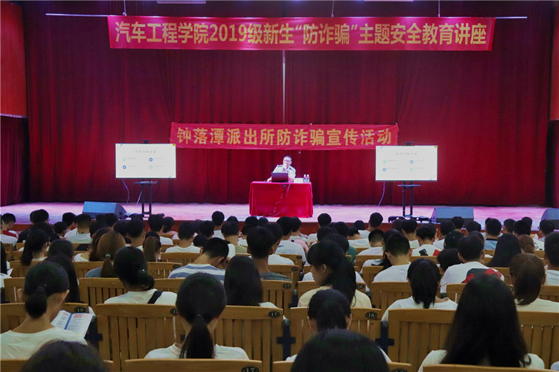 为提高大学生安全意识,增强同学们日常生活的安全防范技巧,远离诈骗之害,构建和谐校园,2019年9月17日下午,汽车工程学院在演艺厅2区105举办安全教育专题讲座,并发放防诈骗宣传资料供同学们学习。本次安全教育专题讲座特邀钟落潭派出所王洪兵警官担任主讲人,为新生普及安全防范知识的重要性和解说现实诈骗案例。出席本次讲座的有汽车工程学院党总支副书记欧敏、学工办主任蔡少德、辅导员刘彩云及汽院2019级全体新生。