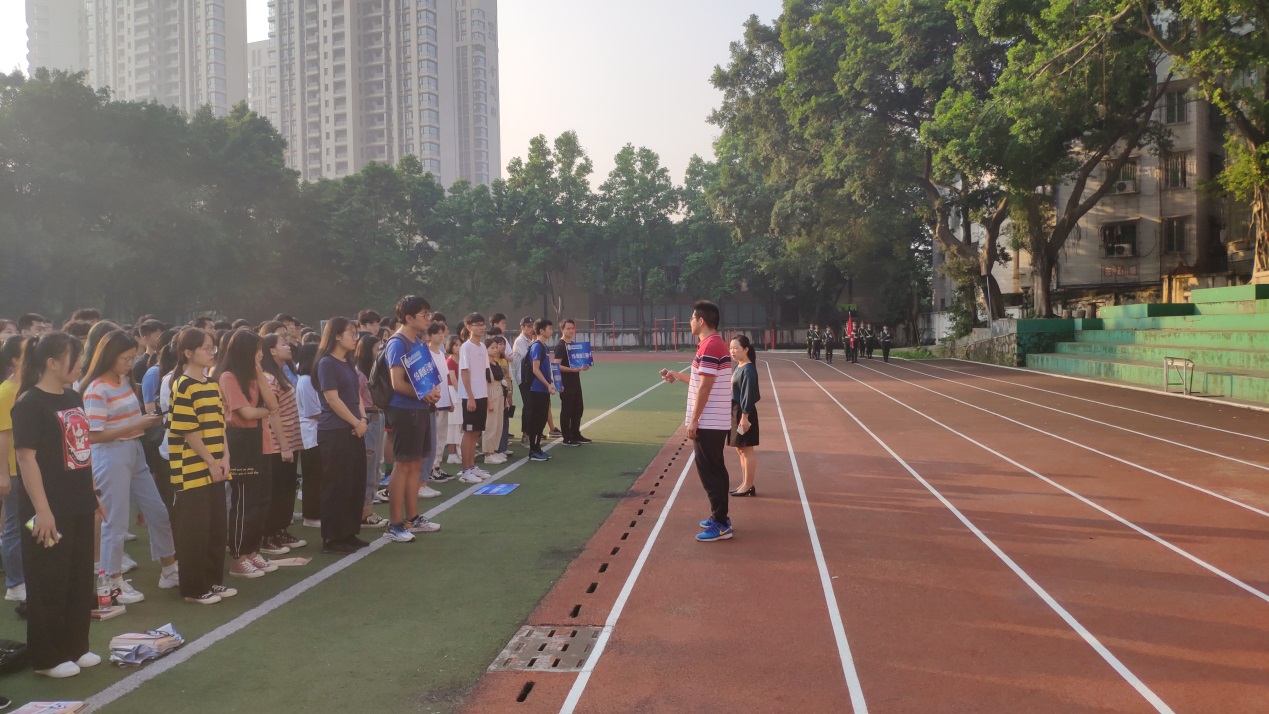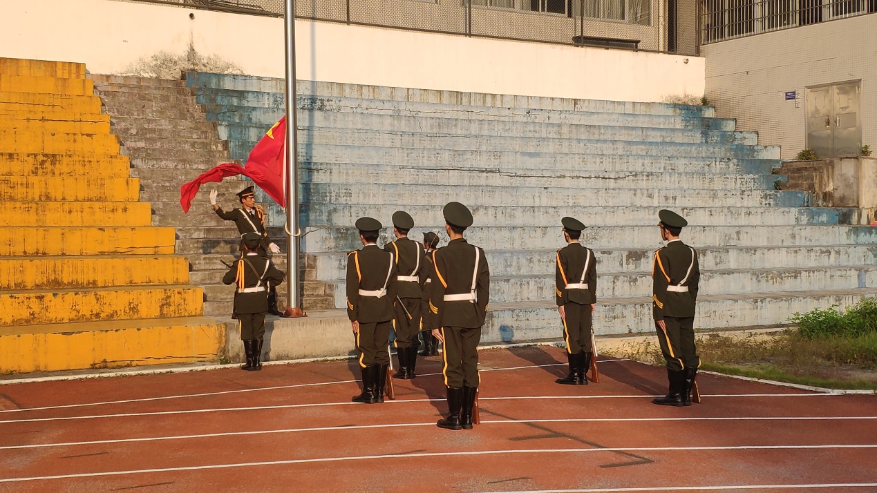 2019年9月29日上午7:20,天气晴朗,阳光明媚。迎着阳光,365官网天河校区足球场上,计算机学院计算机网络技术专业的同学们早早列好整齐的队伍,参加“灯塔工程”系列活动之“我为中华人民共和国升国旗”主题教育,计算机学院分团委书记代启兵老师和辅导员蒋利君老师也参加了升旗仪式。