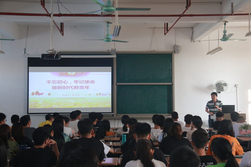 根据《广东省教育厅关于做好2019年秋季学期高校党委书记、校长和院(系)党组织书记、院长(系主任)以及中小学党组织书记、校长上第一堂思想政治理论课工作的通知》要求,结合“不忘初心、牢记使命”主题教育,2019年10月16日下午,汽车工程学院党总支书记彭卫东以《不忘初心、牢记使命,做新时代新青年》为主题在明德楼2区502开展了党总支书记思政第一课,汽车工程学院一百多名2019级新生代表参与了本次活动。