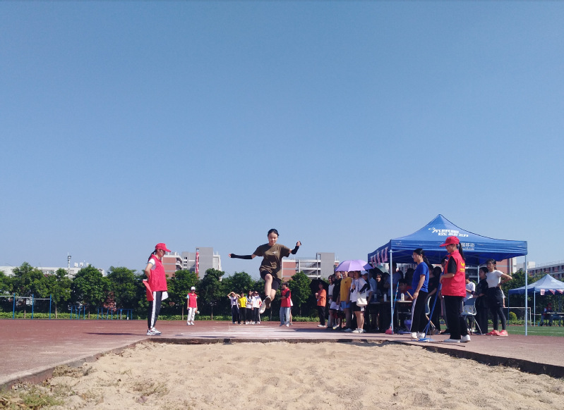 另一边的跳远比赛中,参赛选手依次进行比赛,每位选手都不断调整自己的状态,迈着稳健的步伐开始助跑,到达起跳线,单脚起跳,身体腾空而起。当成功跃过挡在沙坑前的垫子,双脚稳稳地落入沙坑时,选手们几乎都朝上空挥动自己手臂,庆祝自己的成功跳跃。选手们为了取得更好的成绩,他们拼尽全力,即使暂时落后也毫不放弃,他们面对目标跨出坚定的步伐,尝试了数次,这种不断超越自我的精神是个人的巨大财富。