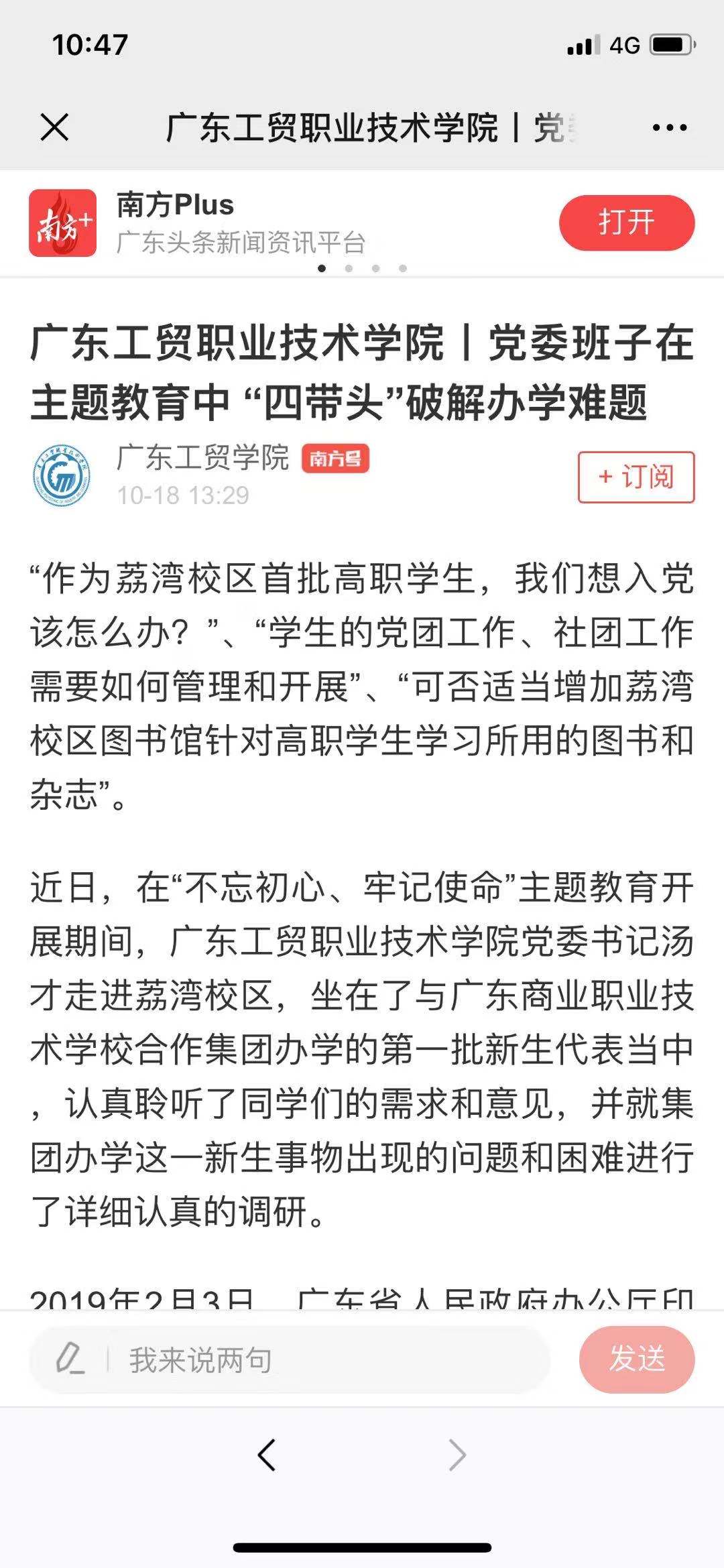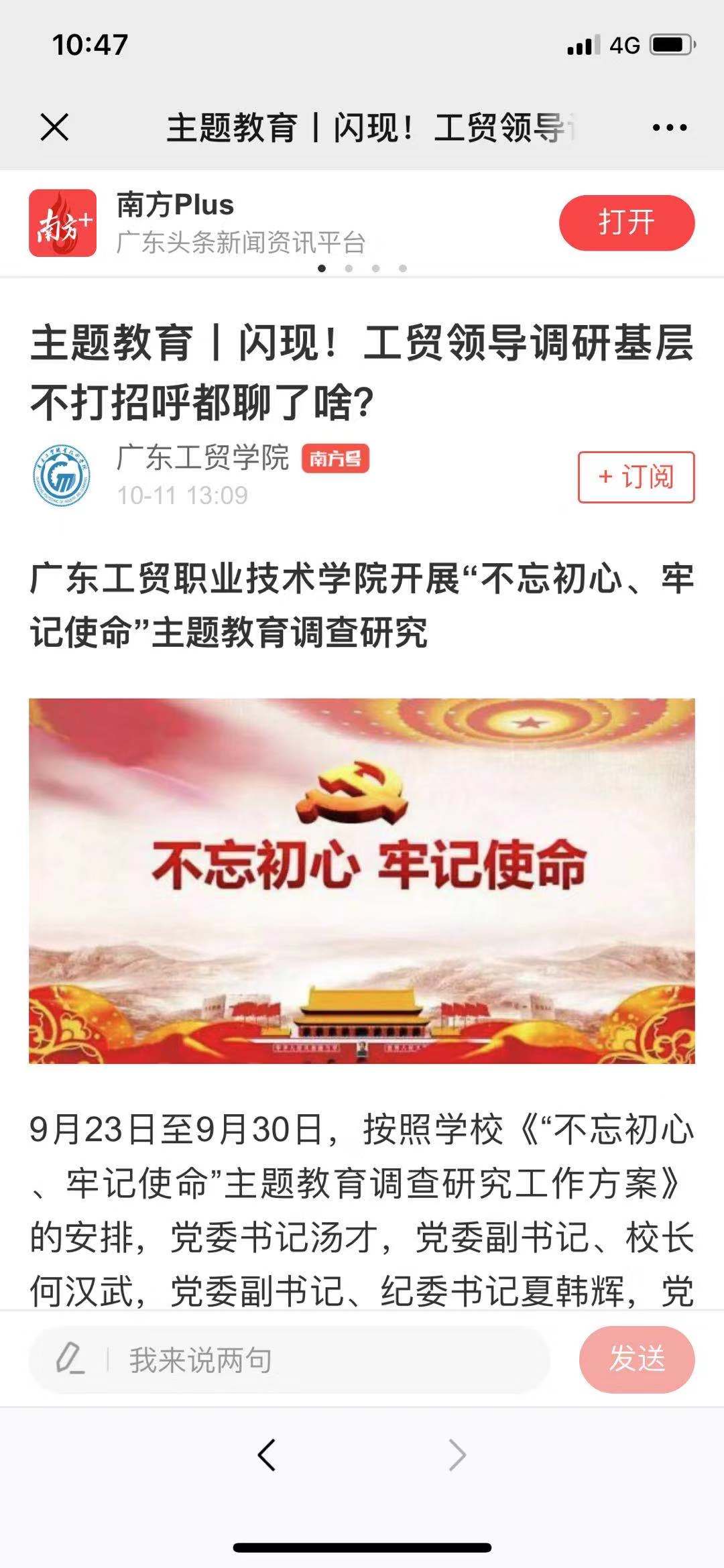 近期,南方报业集团“南方号”平台连续推送3篇365官网“不忘初心、牢记使命”主题教育开展情况。分别是:《【主题教育】不忘初心使命,全新立德树人》、《主题教育丨闪现!工贸领导调研基层不打招呼都聊了啥?》、《bat365在线平台官网丨党委班子在主题教育中“四带头”破解办学难题》。