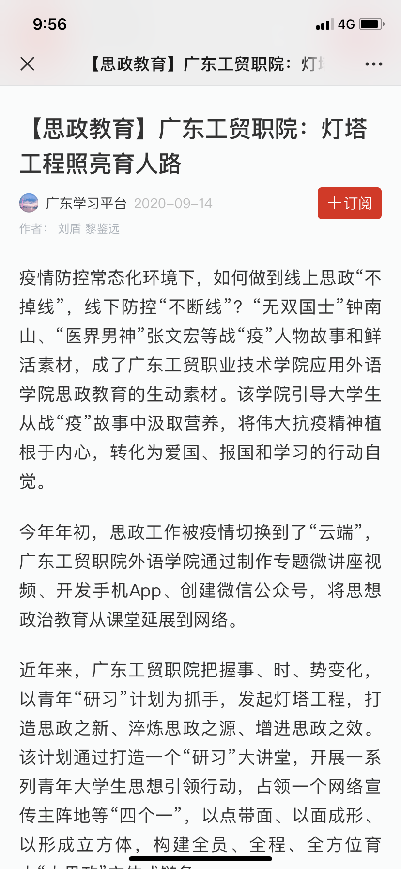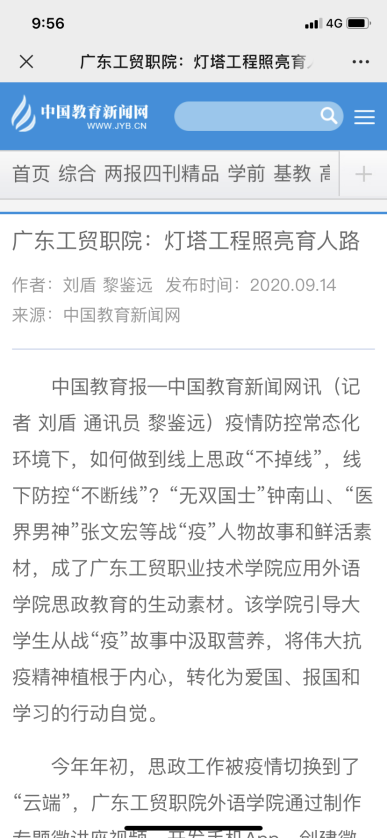 9月14日,学习强国、中国教育新闻网刊登文章《广东工贸职院:灯塔工程照亮育人路》报道365官网思政教育工作新模式。可点击链接查看https://article.xuexi.cn/articles/index.html?art_id=11114230626796076372&item_id=11114230626796076372&study_style_id=feeds_default&pid=&ptype=-1&source=share&share_to=wx_single