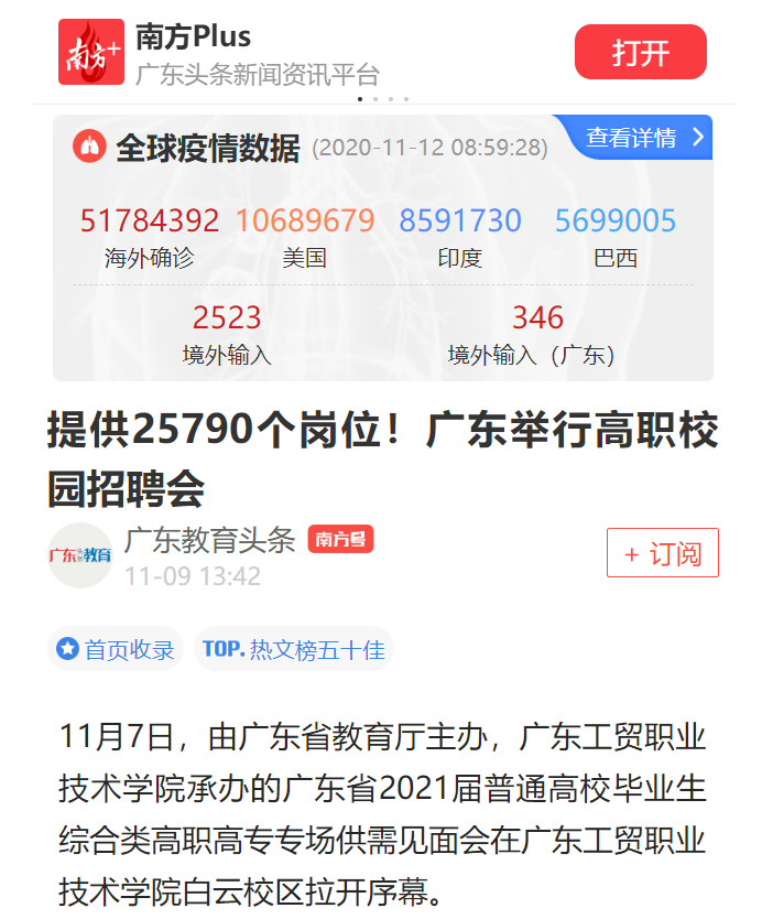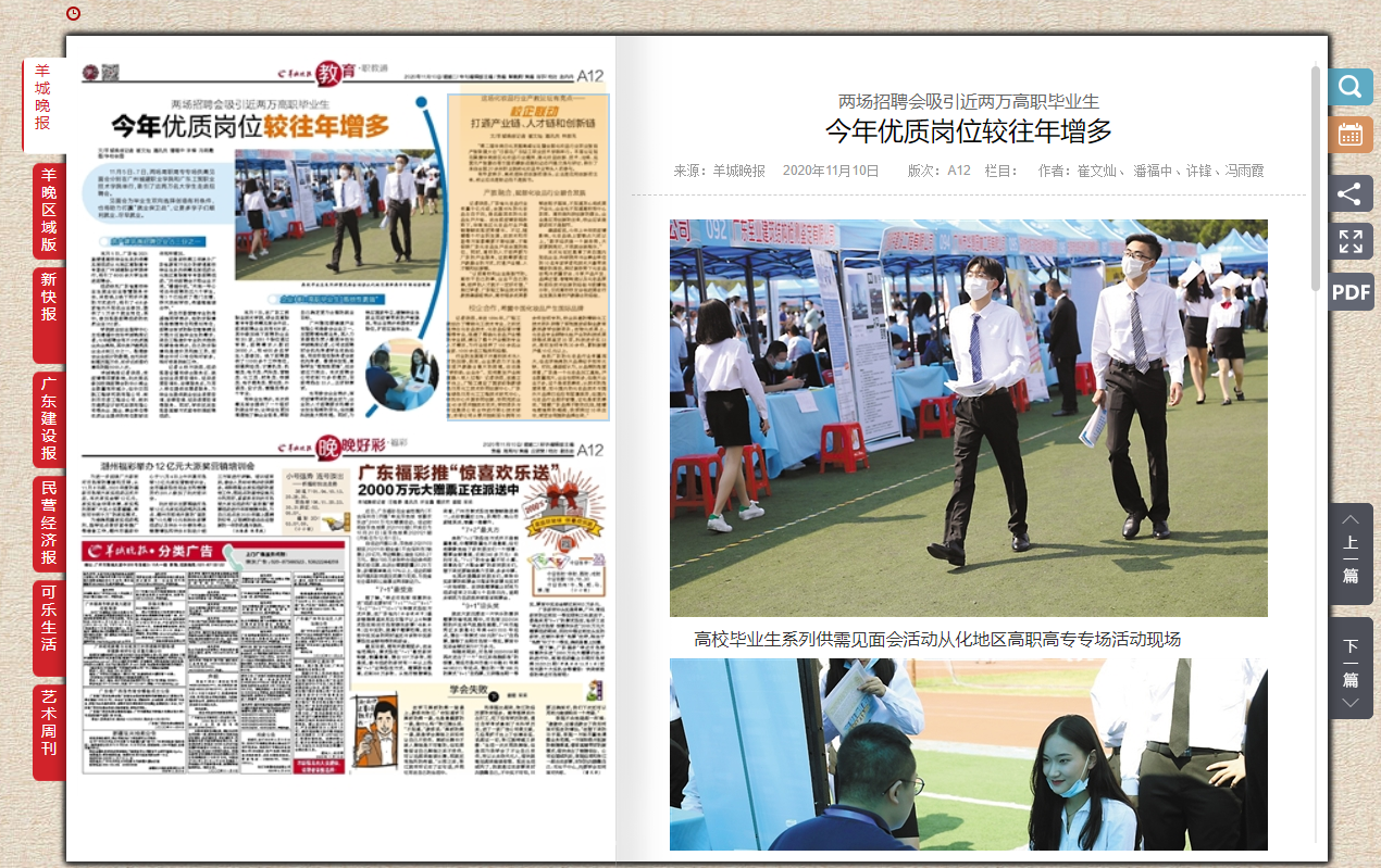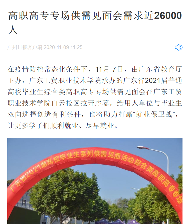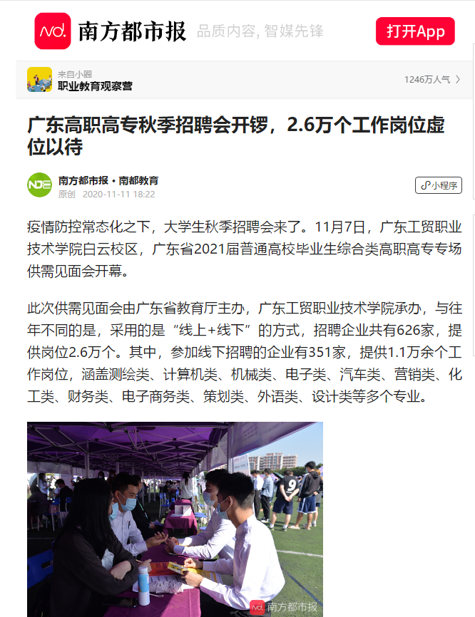 在疫情防控常态化条件下,11月7日,由广东省教育厅主办,bat365在线平台官网承办的广东省2021届普通高校毕业生综合类高职高专专场供需见面会在bat365在线平台官网白云校区拉开序幕。本次供需见面会引起媒体广泛报道,报道详情如下: