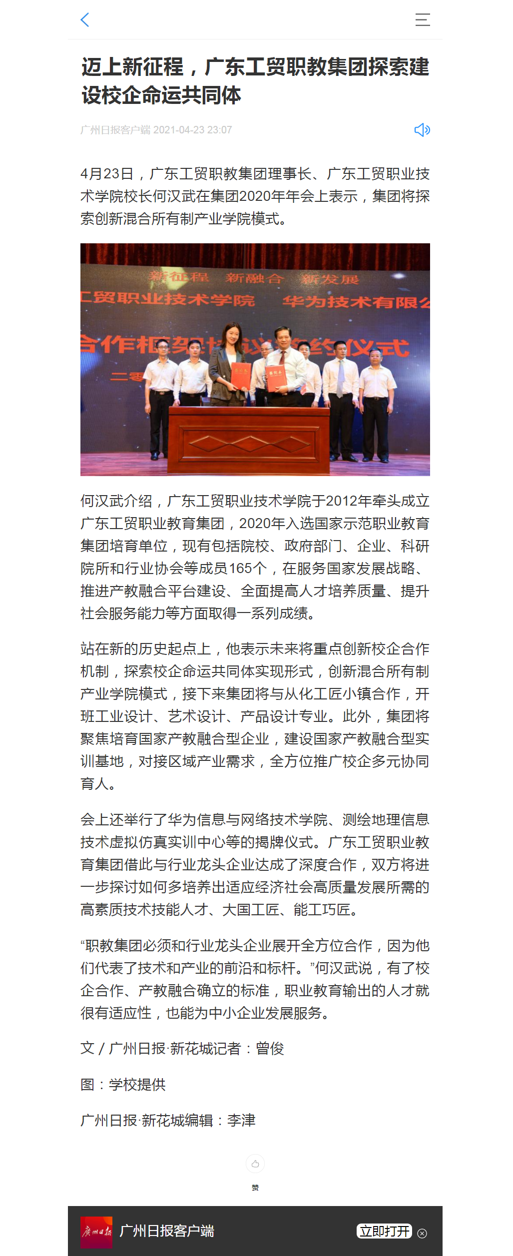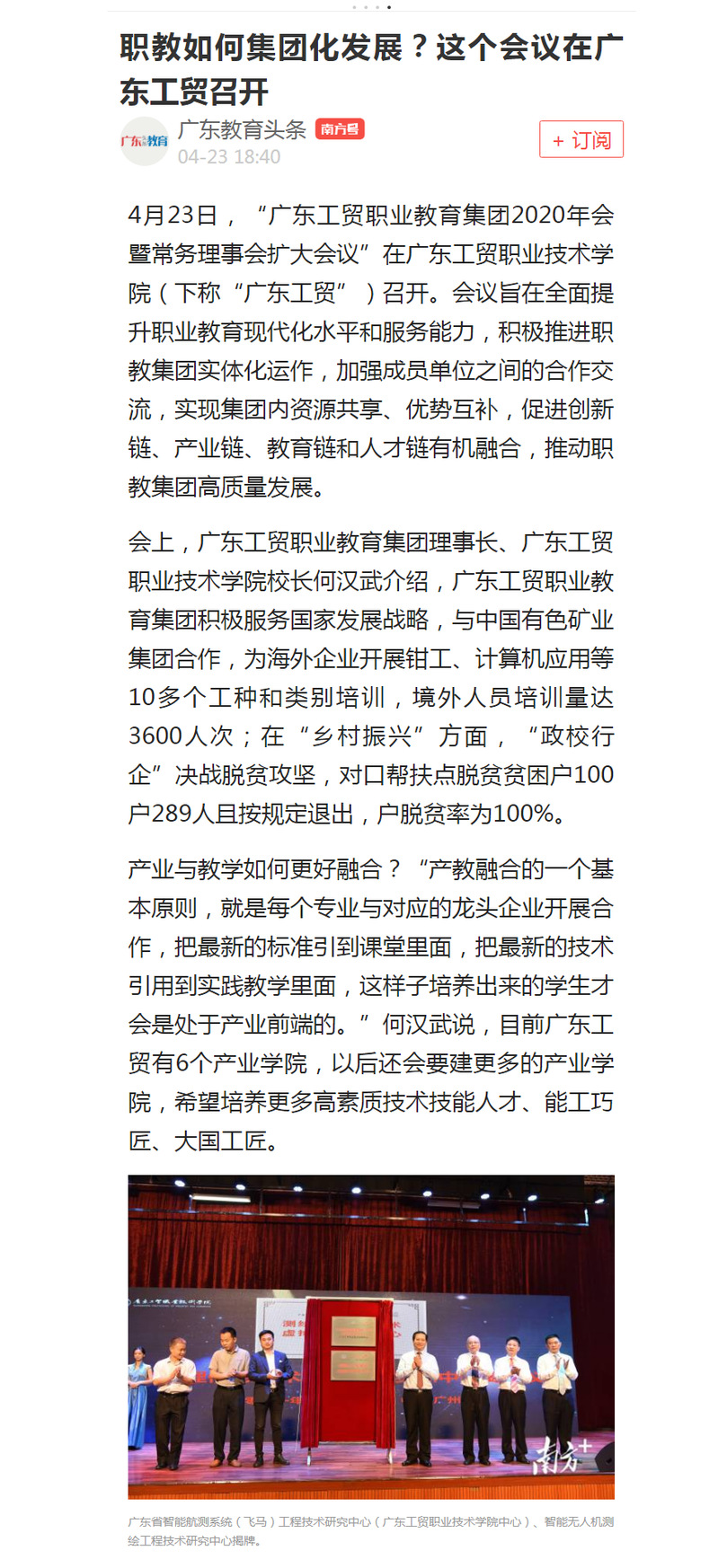 为深入贯彻《国家职业教育改革实施方案》文件精神,4月23日,学校职业教育集团召开以“新征程 新融合 新发展”为主题的2020年会暨常务理事扩大会议。会上还举行了华为信息与网络技术学院、测绘地理信息技术虚拟仿真实训中心等的揭牌仪式。广东工贸职业教育集团借此与行业龙头企业达成了深度合作,双方将进一步探讨如何多培养出适应经济社会高质量发展所需的高素质技术技能人才、大国工匠、能工巧匠。