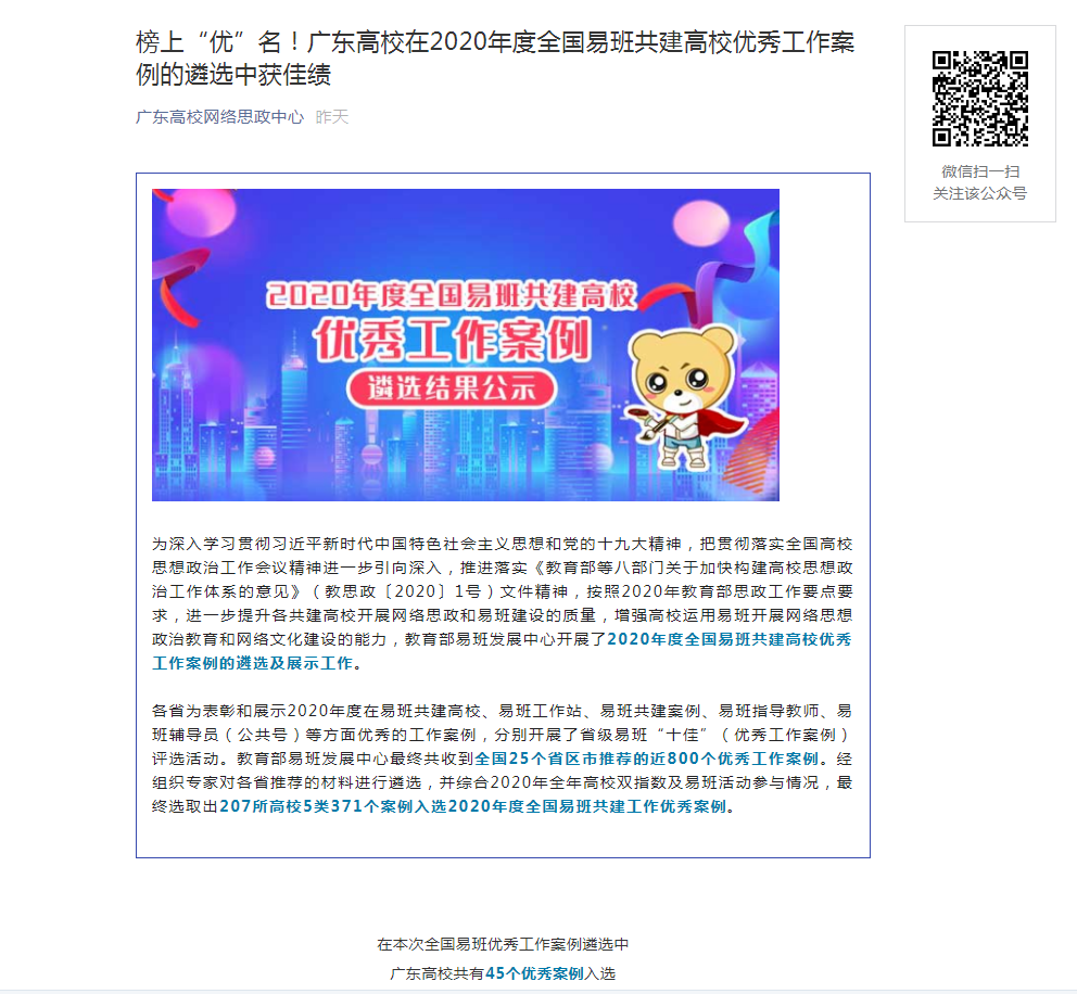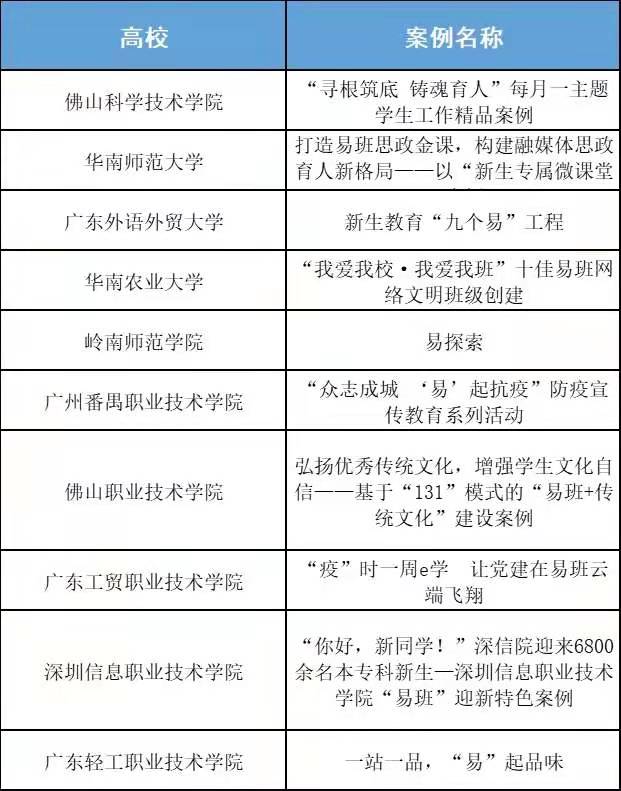 为进一步提升各共建高校开展网络思政和易班建设的质量,增强高校运用易班开展网络思想政治教育和网络文化建设的能力,教育部易班发展中心近段时间开展了2020年度全国易班共建高校优秀工作案例的遴选及展示工作,广东共45个优秀案例入选。