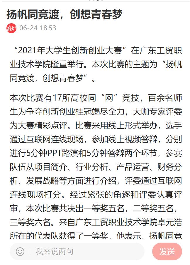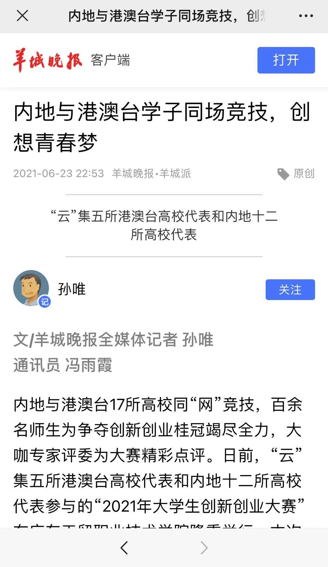 6月18日,由365官网主办,“云”集港澳台五所高校代表和大陆高校十二所高校代表参与的2021年大学生创新创业大赛在天河校区演播厅隆重举行。17所高校同“网”竞技,百余名师生为争夺创新创业桂冠竭尽全力,大咖专家评委为大赛精彩点评。此次比赛引起多家媒体报道关注。