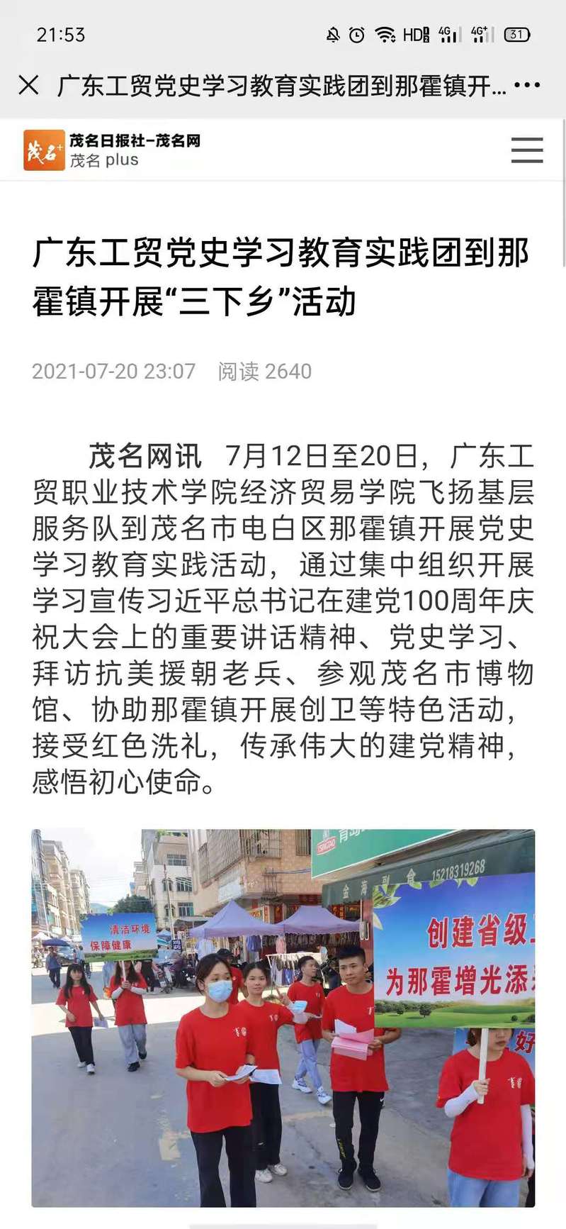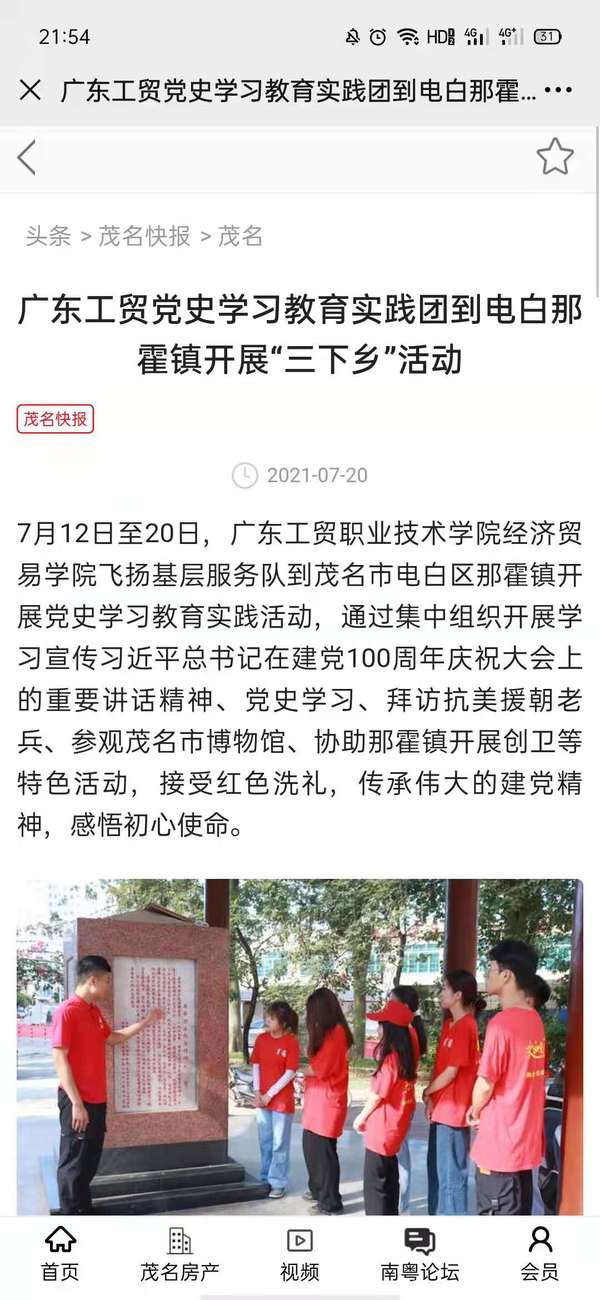 7月12日至20日,365官网经济贸易学院飞扬基层服务队到茂名市电白区那霍镇开展党史学习教育,集中组织开展学习宣传习近平总书记在建党100周年庆祝大会上的重要讲话精神、党史学习、拜访抗美援朝老兵、参观茂名市博物馆、协助那霍镇开展创卫等特色活动。