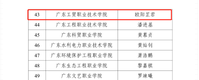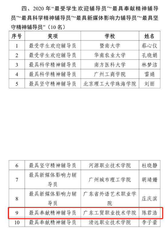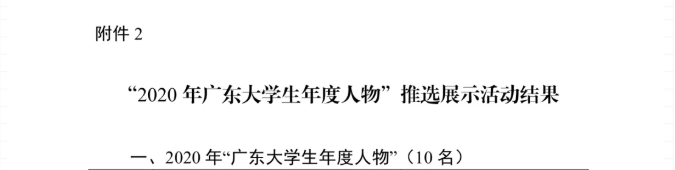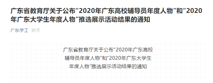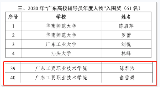 广东省教育厅关于公布“2020年广东高校辅导员年度人物”和“2020年广东大学生年度人物”推选展示活动结果的通知发布。学校测绘遥感信息学院陈君浩、计算机与信息工程学院俞雪娇荣获2020年“广东高校辅导员年度人物”入围奖,陈君浩同时荣获“最具奉献精神辅导员”。应用外语学院2019级旅英2班欧阳芷君荣获2020年“广东大学生年度人物”入围奖。