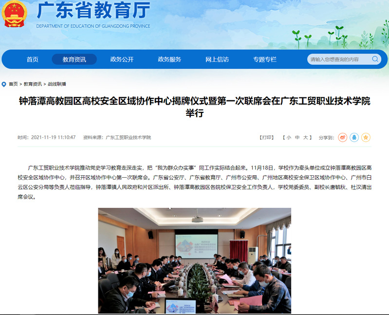 学校推动党史学习教育走深走实,把“我为群众办实事”同工作实际结合起来。11月18日,学校作为牵头单位成立钟落潭高教园区高校安全区域协作中心,并召开区域协作中心第一次联席会。