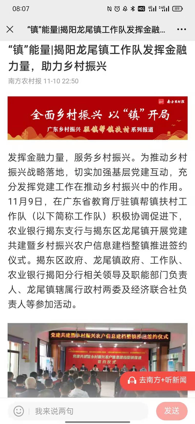 在广东省教育厅驻镇帮镇扶村工作队(以下简称工作队)积极协调促进下农业银行揭阳分行与揭东区龙尾镇开展党建共建暨乡村振兴农户信息建档整镇推进签约仪式。工作队与农行揭阳分行进行了党建共建签约仪式和互授牌匾、赠书。同时,在工作队与农行揭阳分行的见证下,农行揭东支行与揭东龙尾镇签订了《金融服务乡村振兴--农户信息建档整镇推进合作协议》。