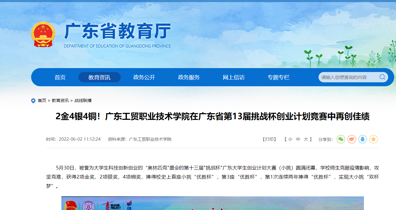 5月30日,被誉为大学生科技创新创业的“奥林匹克"盛会的第十三届"挑战杯"广东大学生创业计划大赛(小挑)圆满闭幕,学校师生克服疫情影响,攻坚克难,获得2项金奖、2项银奖、4项铜奖,捧得校史上首座小挑“优胜杯”,第3座“优胜杯”,第1次连续两年捧得“优胜杯”,实现大小挑“双杯梦”。