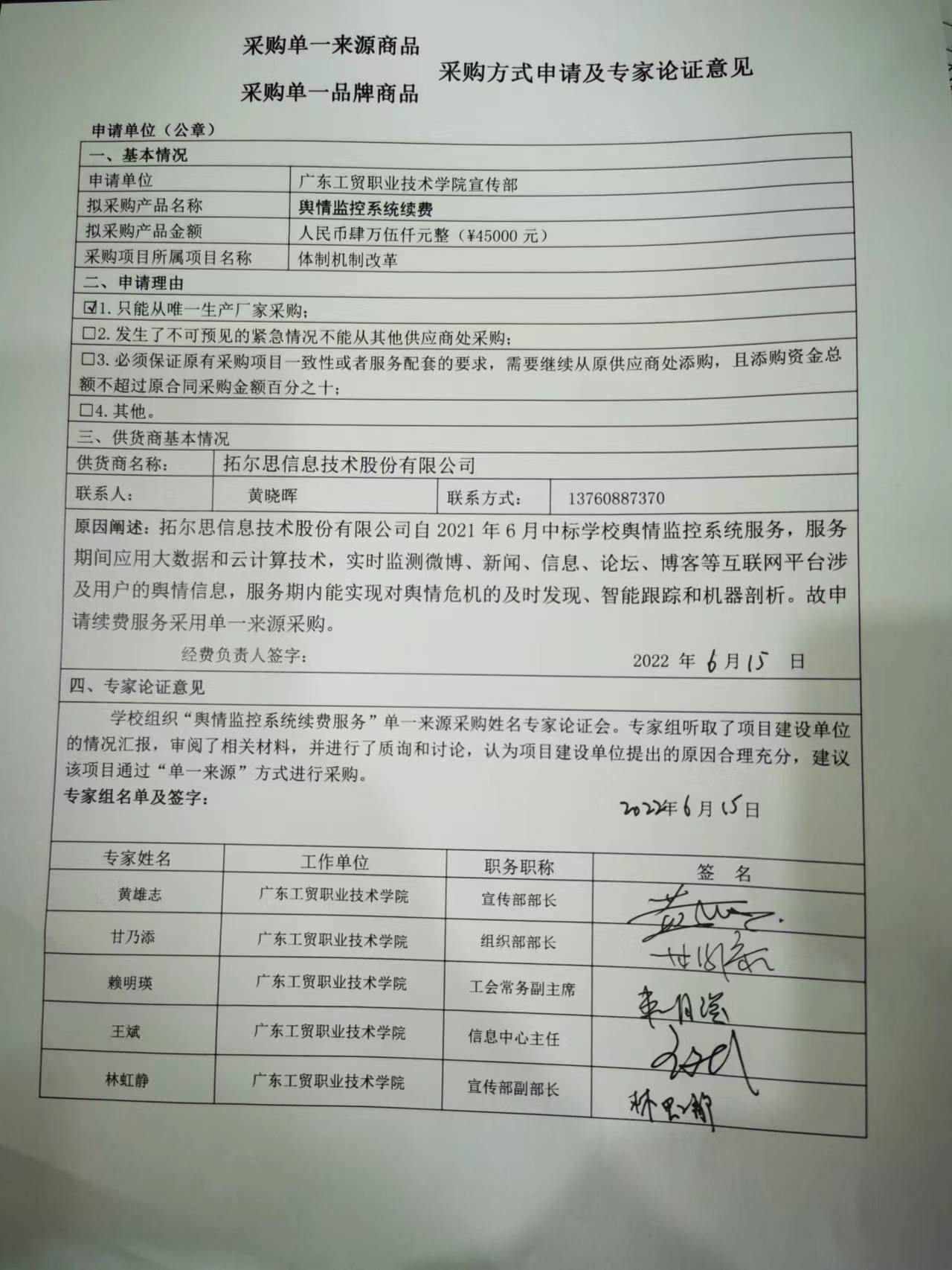 《拓尔思信息技术股份有限公司自2021年6月中标学校舆情监控系统服务,服务期间应用大数据和云计算技术,实时监测微博、新闻、信息、论坛、博客等互联网平台涉及用户的舆情信息,服务期内能实现对舆情危机的及时发现、智能跟踪和机器剖析。故申请续费服务采用单一来源采购。