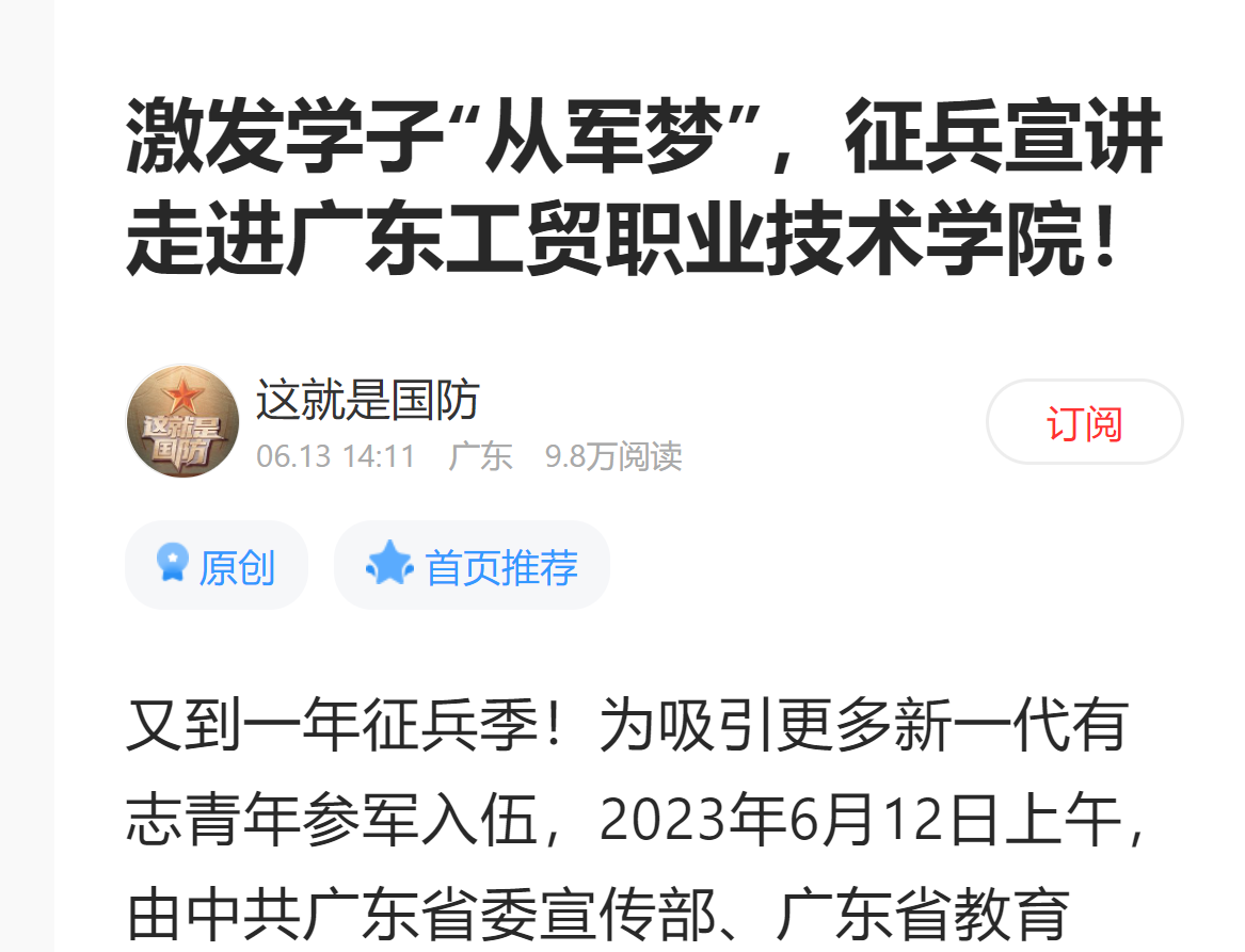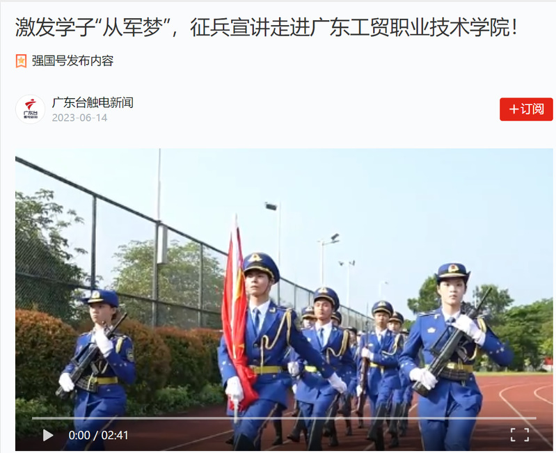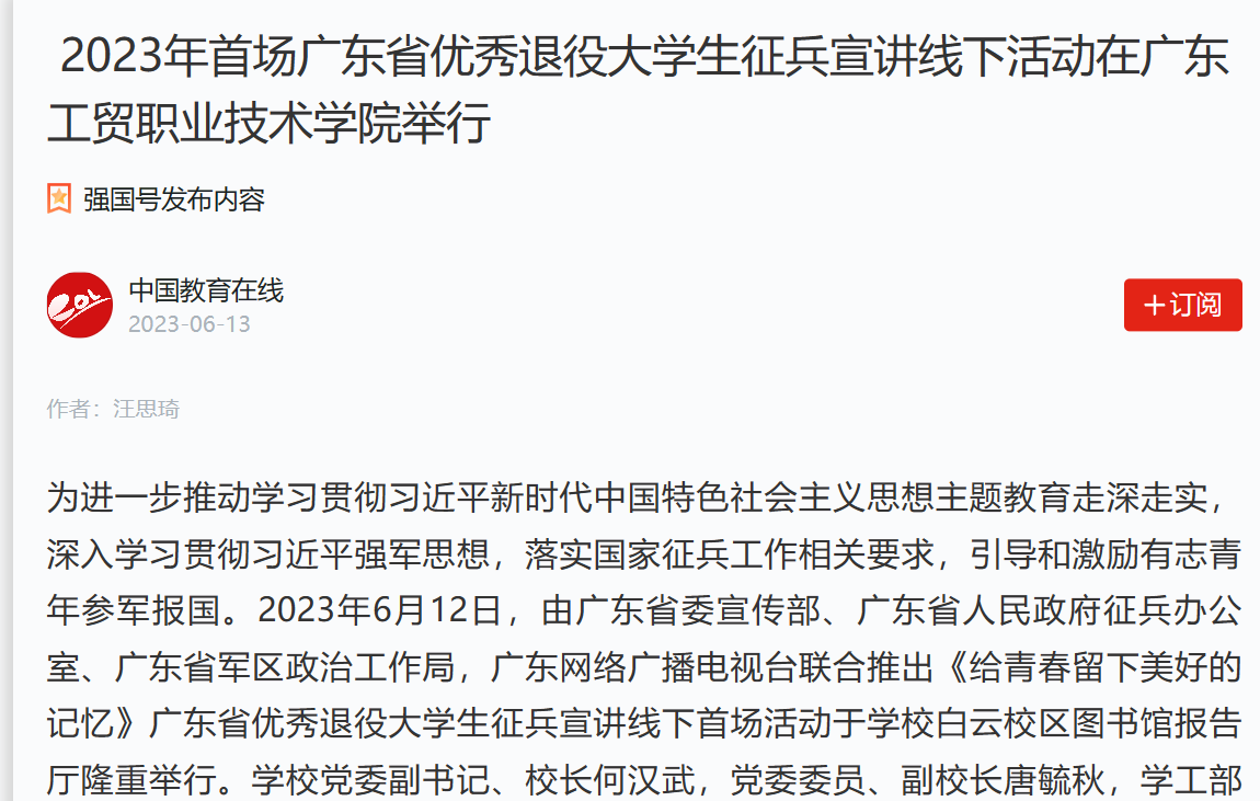 为进一步推动学习贯彻习近平新时代中国特色社会主义思想主题教育走深走实,深入学习贯彻习近平强军思想,落实国家征兵工作相关要求,引导和激励有志青年参军报国。2023年6月12日,由广东省委宣传部、广东省人民政府征兵办公室、广东省军区政治工作局,广东网络广播电视台联合推出《给青春留下美好的记忆》广东省优秀退役大学生征兵宣讲线下首场活动于学校白云校区图书馆报告厅隆重举行。学校党委副书记、校长何汉武,党委委员、副校长唐毓秋,学工部负责同志、各二级学院征兵工作负责人以及500余名学生参加了本次活动,广东省军区动员局参谋盛夏应邀出席并作征兵政策宣讲。