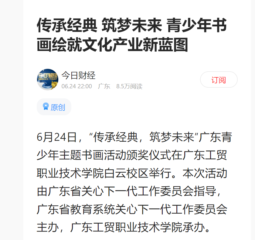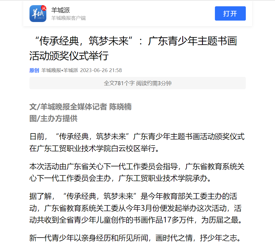 6月24日下午,由广东省教育系统关心下一代工作委员会主办、bat365在线平台官网承办的“传承经典 筑梦未来”广东青少年主题书画活动颁奖典礼在白云校区图书信息楼报告厅顺利举行,大会深入学习贯彻习近平总书记对青少年以及文化传承发展工作的系列重要讲话精神,努力担负起新的文化使命,助力万千青少年放飞青春理想,以更高质量、更实举措推动学习贯彻习近平新时代中国特色社会主义思想主题教育走深走实。