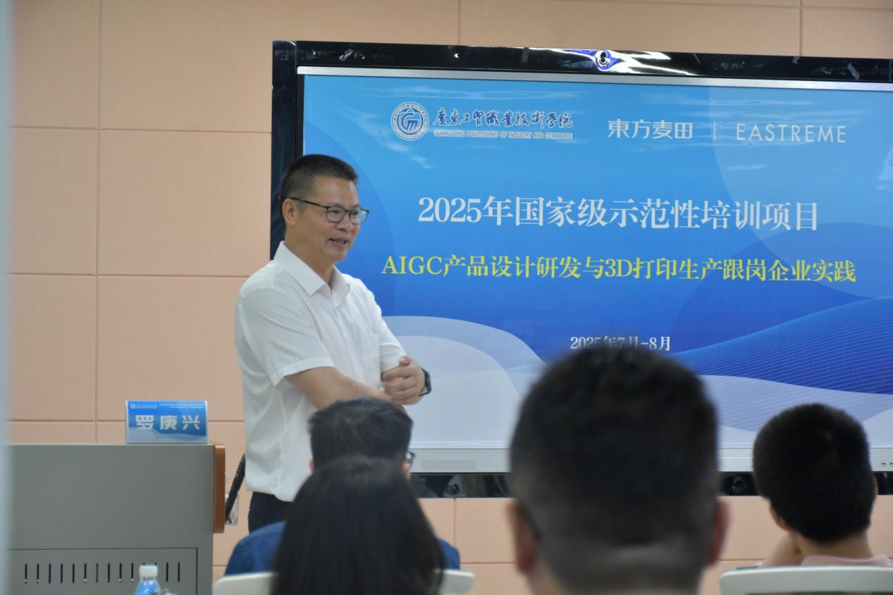 七月羊城,热浪袭人,却挡不住“AIGC产品设计研发与3D打印生产跟岗企业实践”国家级培训班内高涨的学习热情。经过紧张充实的七天岗前集中培训,来自广东省高职院校的青年教师们正沉浸在一场融合最前沿科技与真实产业脉搏的知识风暴中。专家金句频出、学员实操热火朝天、3D打印机嗡鸣不断,共同勾勒出一幅产教深度融通的生动图景。