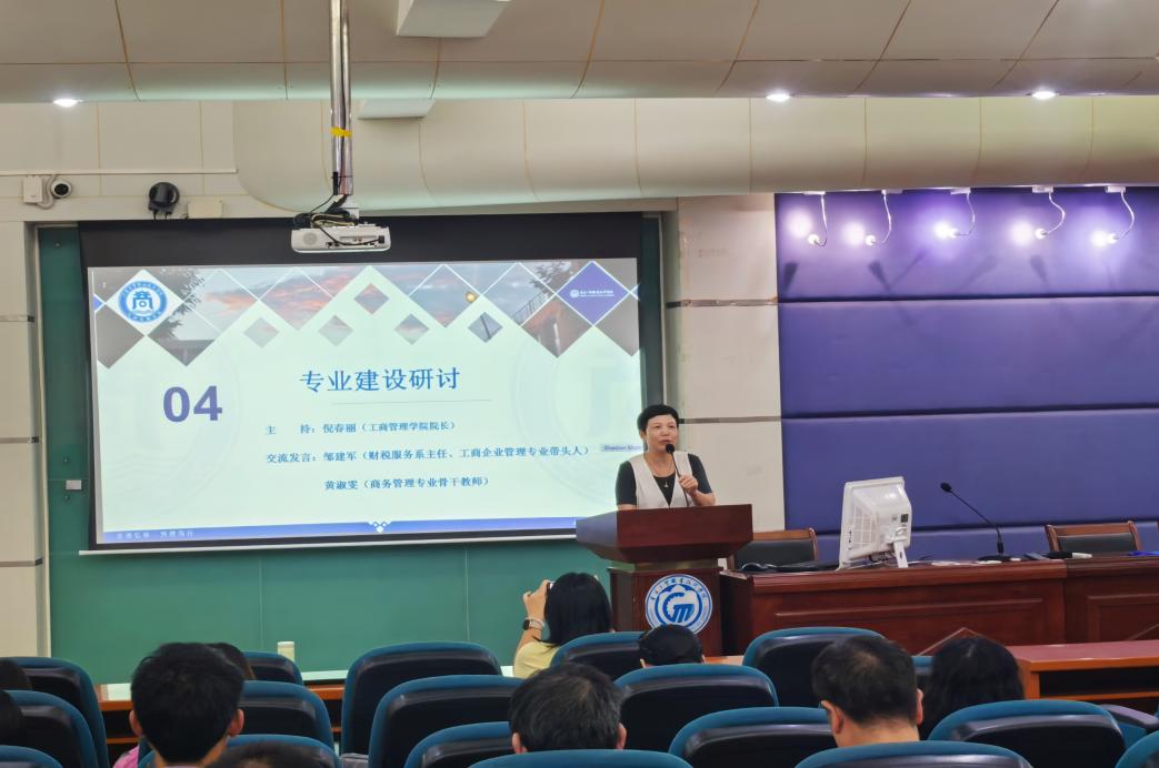 商务管理专业骨干教师黄淑雯通过近三年全国及我省同类专业开设及招生数据分析,对商务管理专业的发展现状、办学特色及未来3年专业优化升级思路和举措作了重点汇报。