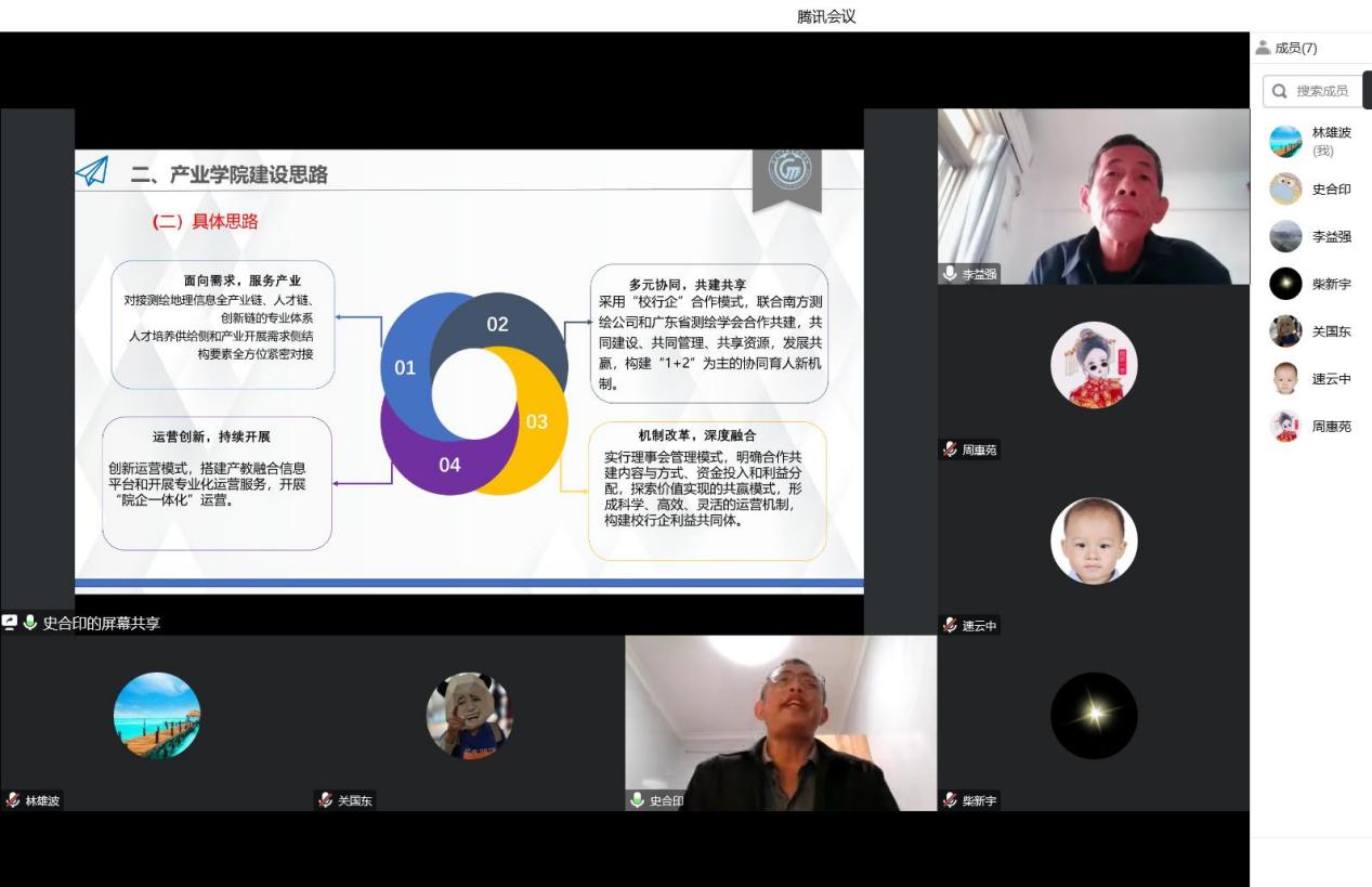 12月8日我院通过在线会议方式召开“广东工贸-南方测绘智能测绘产业学院”建设方案线上研讨会。参加此次会议的人员分别有测绘遥感信息学院党总支书记、院长速云中、产业学院负责人李益强、办公室主任林雄波、史合印、柴新宇。广州南方测绘科技股份有限公司副总经理郭宝宇、副总经理助理周惠苑、总工张少铖、技术部经理姜昀呈、营销部经理关国东,研讨会由李益强主持。