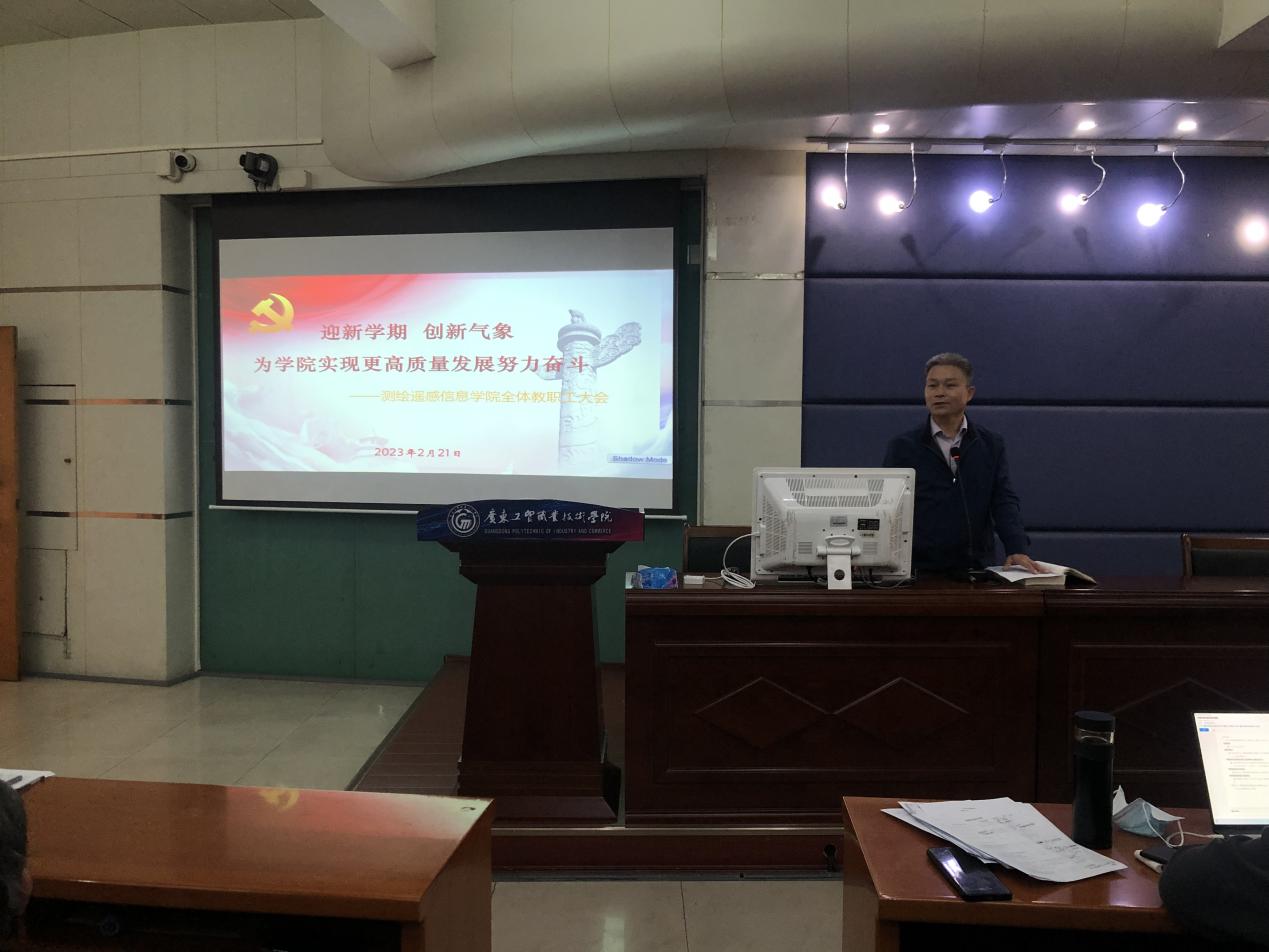 为进一步学习贯彻习近平新时代中国特色社会主义思想,持续推进政治理论学习入深入实,同时多措并举促进2023届毕业生更好就业,以高质量发展成效迎接学院“双高”专业群建设的验收工作。2月21日,测绘遥感信息学院在天河校区报告厅召开全体职工政治学习会议暨新学期工作部署会议,学院党总支书记兼院长速云中主持会议并组织政治学习,学院全体职工参加会议。会议主题是:迎新学期,创新气象,为学院实现更高质量发展努力奋斗。
