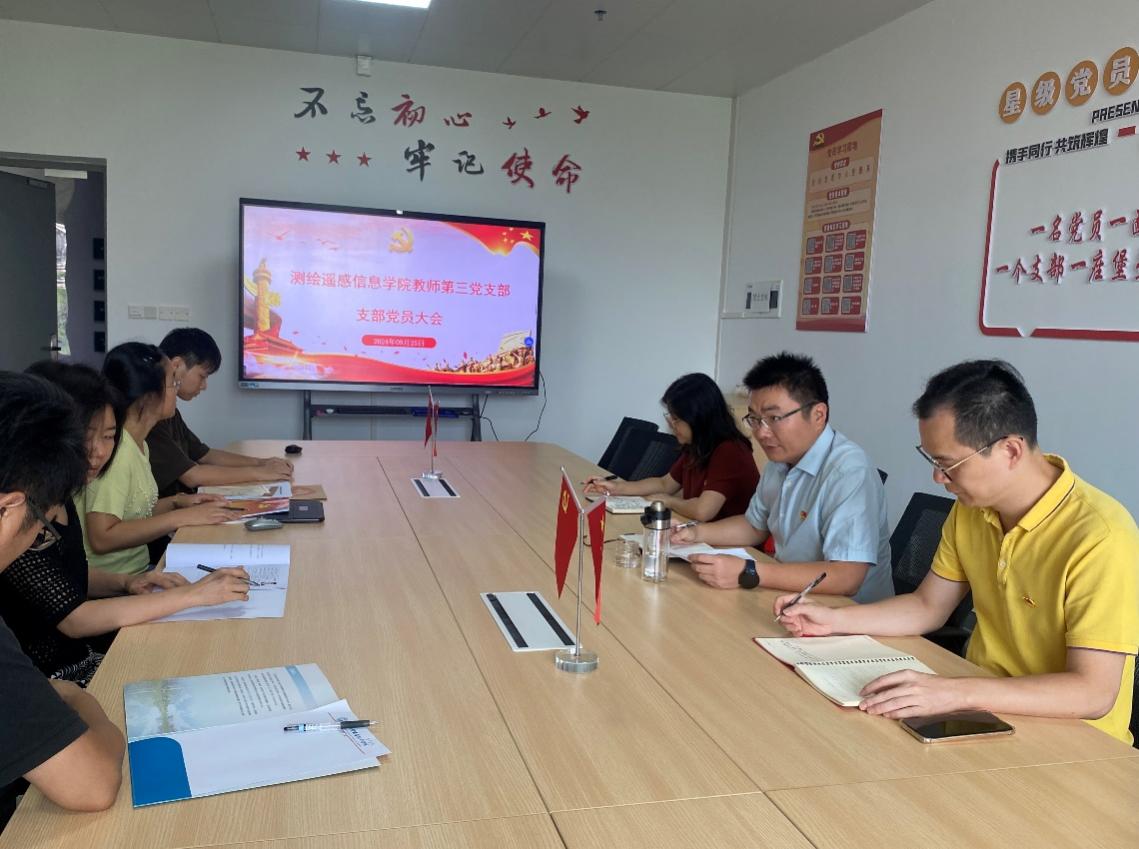 2024年9月24日,测绘遥感信息学院教师第三党支部在博学楼2-303测绘学院第一会议室召开党员大会,支部全体党员参会。共同学习党的二十届三中全会精神和全国教育大会精神以及党的重大政治成果和重要政治要求,在支部书记高照忠同志的带领下,共同重温入党誓词。