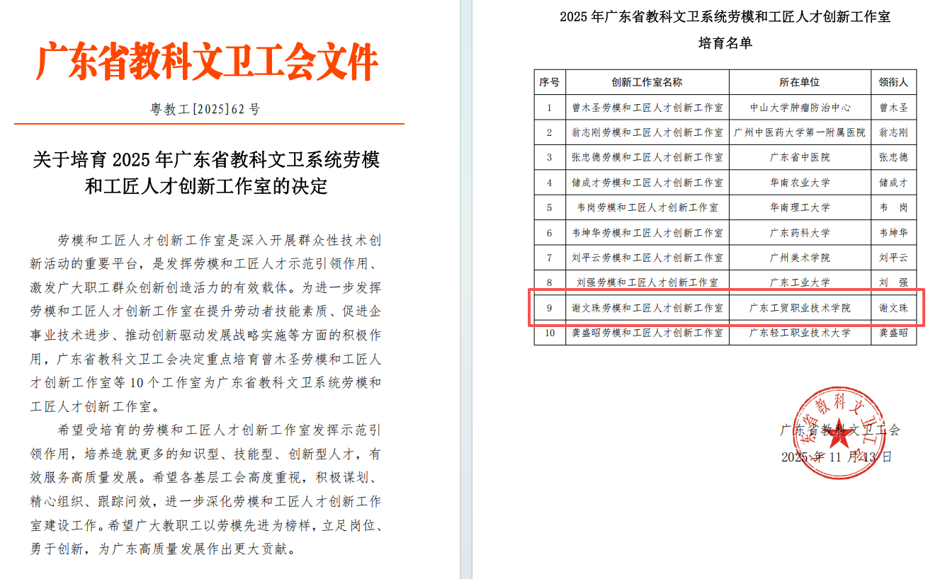 近日,广东省教科文卫工会发布了《关于培育2025年广东省教科文卫系统劳模和工匠人才创新工作室的决定》,365官网测绘遥感信息学院申报的“谢文珠劳模和工匠人才创新工作室”经过层层选拔,成功获批,被确定为省级重点培育的劳模和工匠人才创新工作室。这是365官网在高层次人才创新平台建设上取得的又一重要突破。