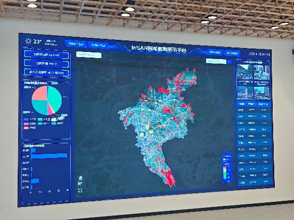 交流伊始,在白云分院丁伟副院长、邹煜星经理的陪同下,校方一行率先参观企业一楼展厅。企业方以InSAR监测展示平台、建筑安全监测平台、白云区低空一体化森林防火监测平台为核心,系统展示了其在测绘遥感、安全监测、应急保障等领域的业务布局与技术应用成果,为后续人才需求对接提供了直观的行业背景支撑。