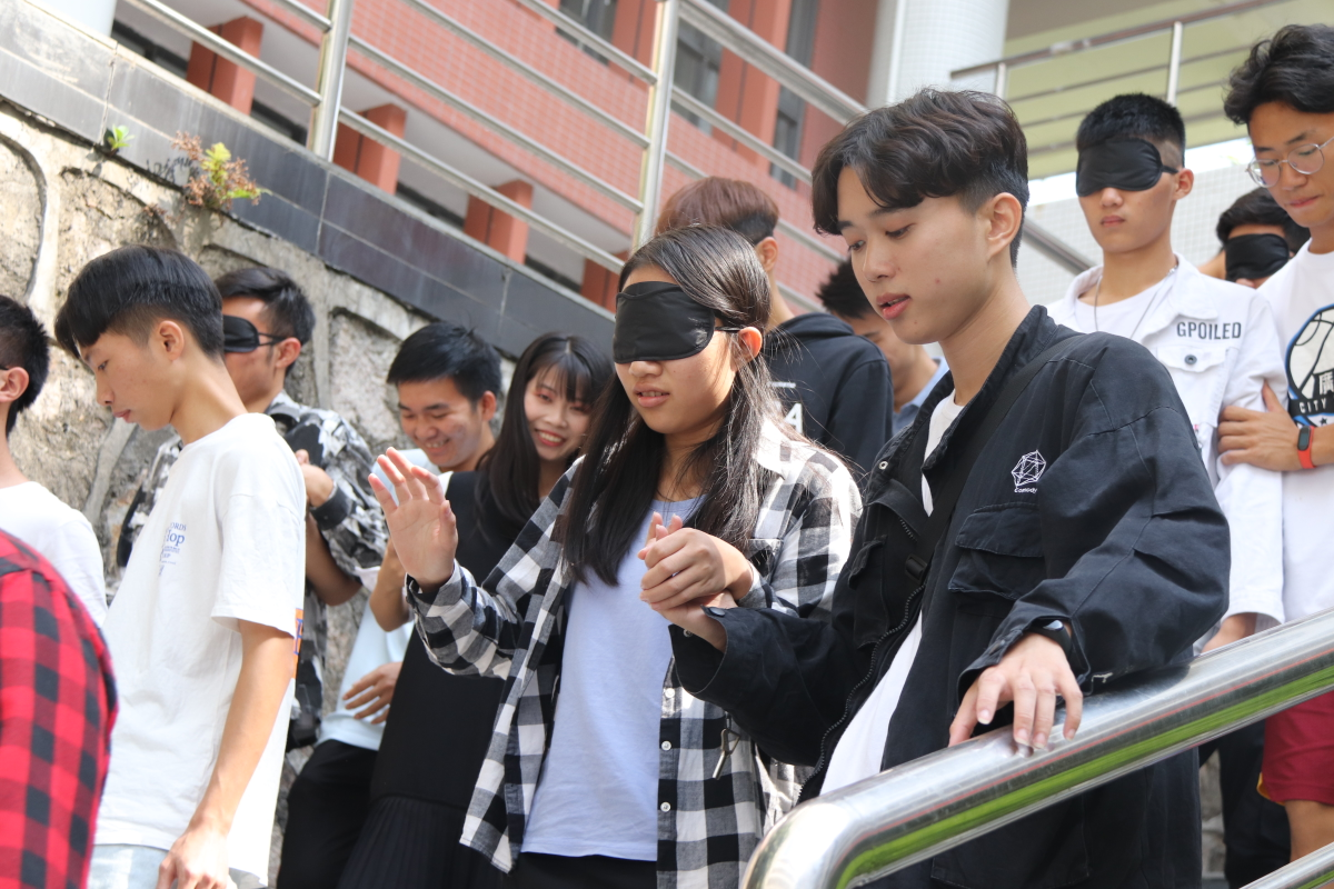 汇演结束后,接下来就是素质拓展活动环节,由学生会主席施安然主持“抓住好运”、“井然有序”、“风雨人生路”活动。学生会干事们排成10列队形,等待人生路的启程,一部分干事带上眼罩充当盲人,另一部分干事充当哑人,“盲人”在“哑人”的引领下完成绕广场一周的“旅程”。该活动旨在让学生会干事们能更快的融入这个大家庭,不分彼此,相爱互助,共同进步。