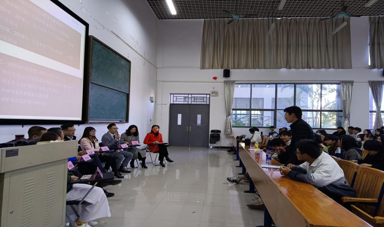 在随后的互动交流环节中,在场学生们踊跃提问,希望能得到师兄师姐的指点和建议,校友也非常热情、详细地回答了现场学生关于汽车销售行业的工资待遇、如何获取客户资源、如何维持客户关系等方面的问题。