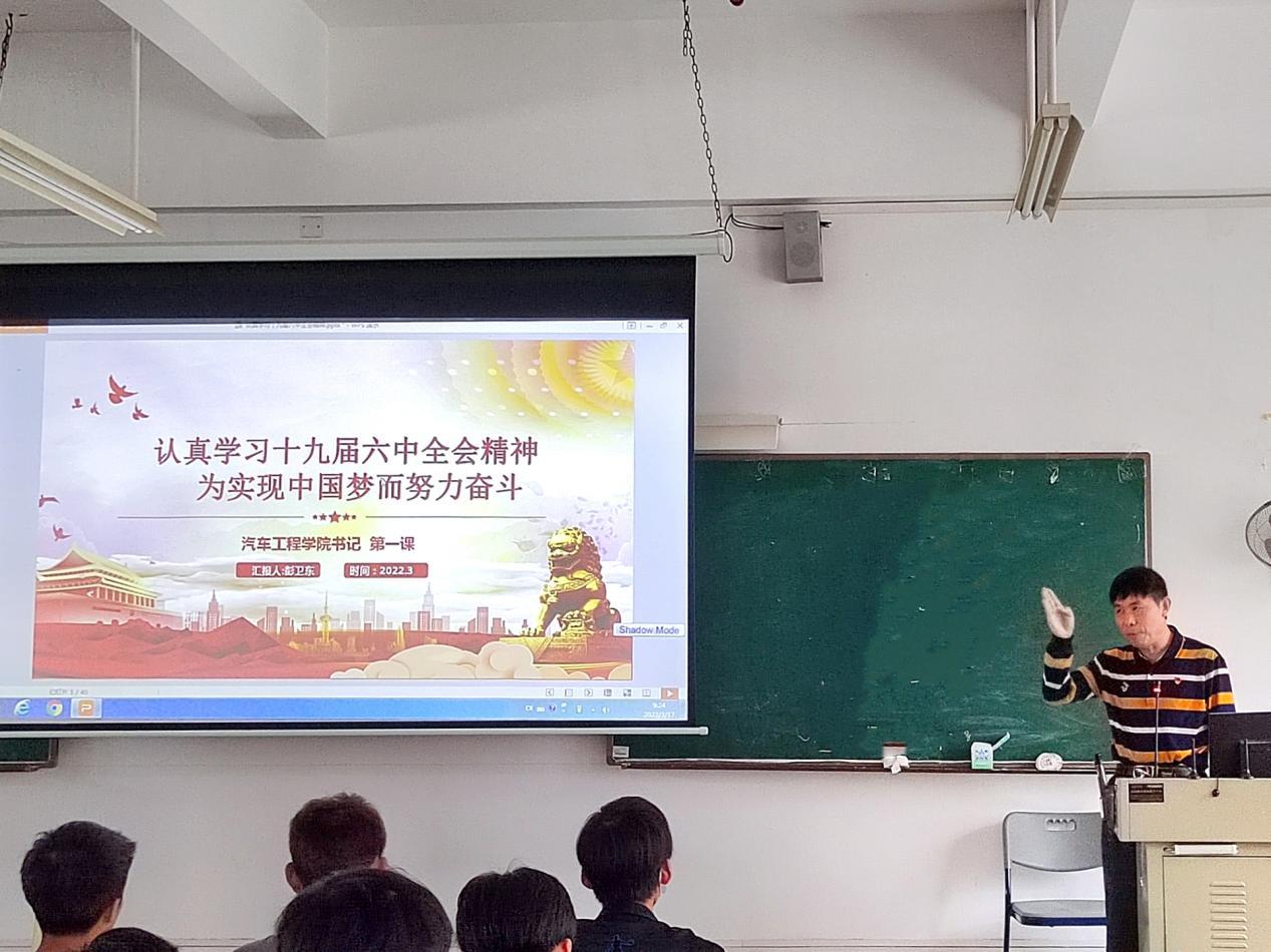 为进一步深刻领悟中国共产党百年来的奋斗历程和辉煌成就,学习贯彻党的十九届六中全会会议精神2022317日上午,汽车工程学院党总支书记彭卫东在明德楼2304开展主题为认真学习党的十九届六中全会精神,为实现中国梦而努力奋斗思想政治理论第一课。2021部分学生参与了此次会议。