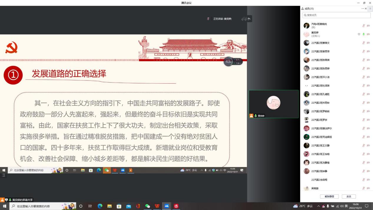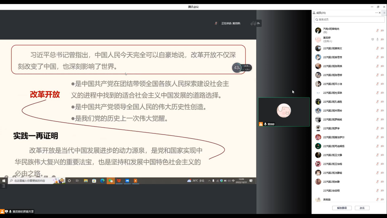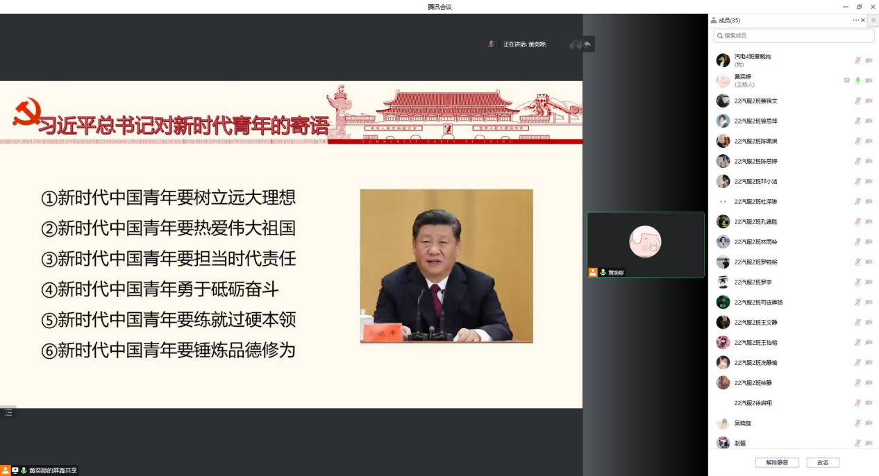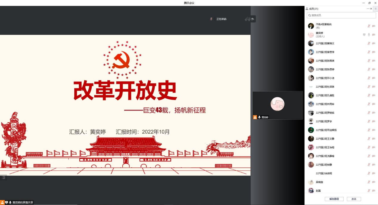 为认真贯彻习近平总书记重要讲话和中央政治局会议精神,不断提高党史学习教育的高度、深度、广度,引导广大学子坚定信念和使命,同时结合党史学习教育“五个一”活动,bat365在线平台官网学生党史宣讲团成员黄奕婷于10月31日下午3点半在腾讯会议平台向汽车工程学院2022级汽车营销与服务专业2班的同学们宣讲改革开放史。