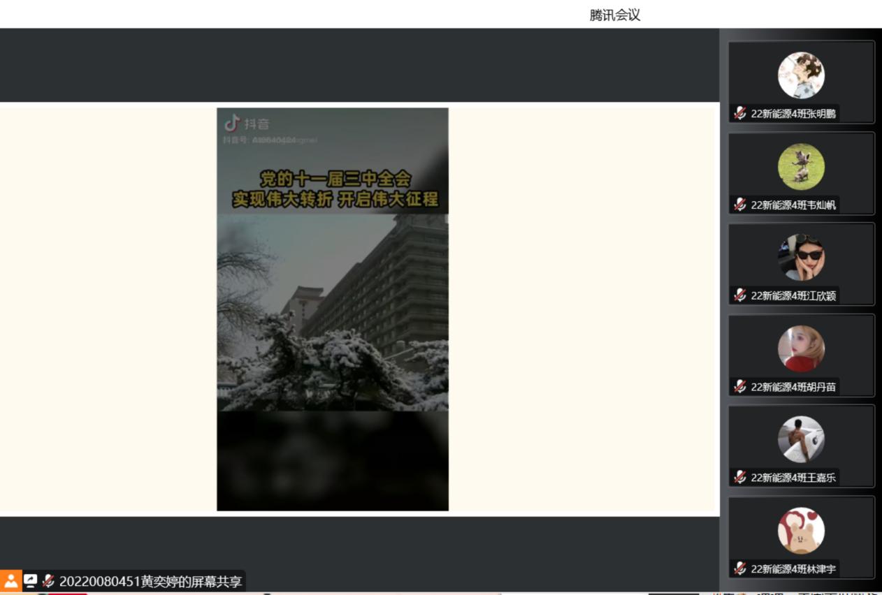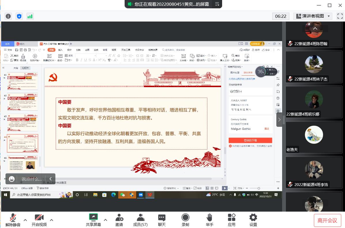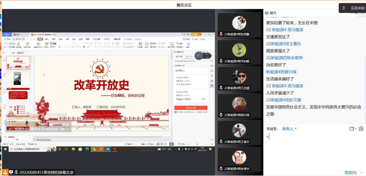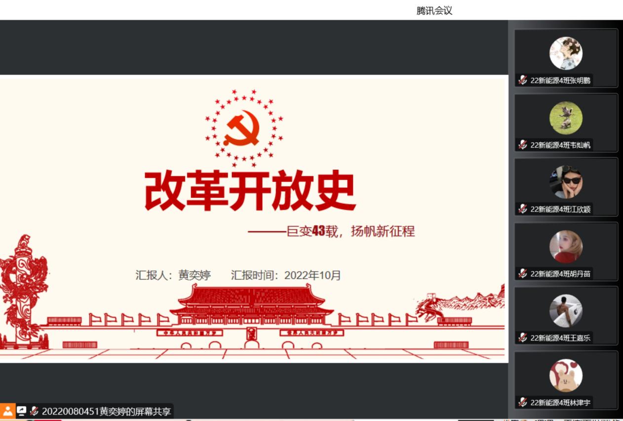 为深入学习贯彻党的二十大精神,推动党史学习教育深入青年,不忘初心,牢记使命,弘扬伟大建党精神,10月31日上午9点,bat365在线平台官网“学生党史宣讲团”成员黄奕婷面向汽车工程学院2022级新能源汽车技术4班同学开展了线上党史宣讲——改革开放史。