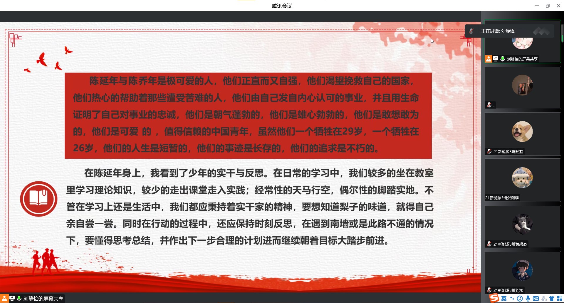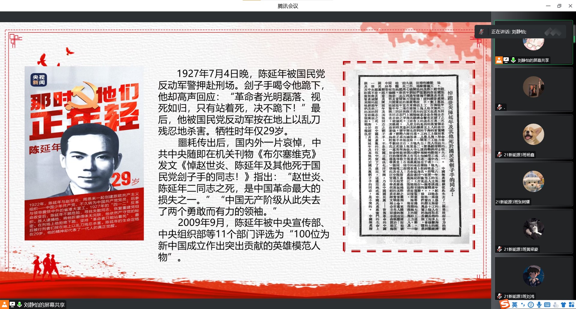为深入开展党史学习教育,加强青年学生思想政治引领,厚植爱党爱国情怀,推动党史学习教育走深走实,10月30日下午七点,bat365在线平台官网“学生党史宣讲团”成员刘静怡带领21新能源3班开展线上党史故事宣讲活动。 刘静怡宣讲血染龙华两兄弟党史故事 党课伊始,刘静怡讲到在陈延年身上,我看到了少年的实干与反思。在陈乔年身上,我看到了少年的纯洁美好与信念坚定。觉醒年代已经过去,虽不能至,心向往之,但青春精神将永留人间。百年来,桀骜少年徒手摘星,星星映在他们眼底,光却洒在我们身上,我们用这光,继续照亮中华民族,生生不息。每一个青年榜样拼命换来的美好生活,我们都要好好珍惜;每一个刻骨铭心的青春精神,我们都要牢牢铭记。我们当以青春名义,立下鸿鹄志向,做好正确之事,走向光明大道。 党课截图 刘静怡介绍到,陈延年在遭国民党军警逮捕后,敌人为了得到上海中共党组织的秘密,对陈延年用尽酷刑,将他折磨得体无完肤。但陈延年以钢铁般的意志,严守党的秘密,宁死不屈。在被国民党反动军警押赴刑场刽子手喝令他跪下时,他却高声回应:“革命者光明磊落、视死如归,只有站着死,决不跪下!”其后陈延年英勇就义。时隔一年后陈乔年被捕,在监狱中,敌人对陈乔年施尽酷刑。他坚贞不屈,始终严守党的秘密。牺牲前,监狱中的战友为他即将被害十分难过,陈乔年却镇静地对他们说:“人总有一死,血不会白流,让子孙后代享受前人披荆斩棘的幸福吧!” 党课截图 党课最后,同学们纷纷感慨到英雄已逝,风范长存。作为新时代中国青年,在享受着前人披荆斩棘带来的幸福同时更要胸怀缅怀之心,提高自身本领,掌握专业技能,争取把所学知识投入到建设现代化强国中。 (汽车工程学院学生党支部 图、文/王嘉豪 编辑/刘彩云 审核/欧敏) |