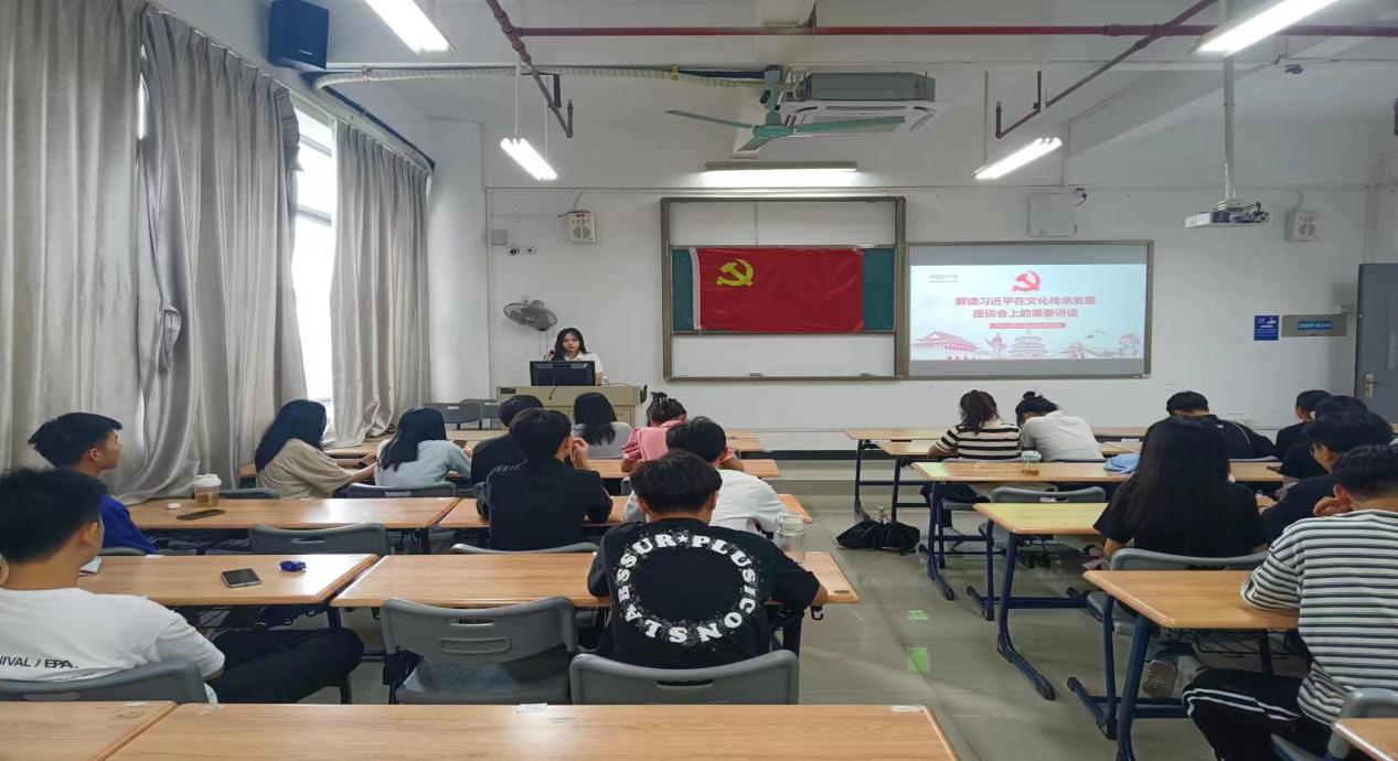 最后,刘金娜同志向大家解读习近平总书记在文化传承发展座谈会上的重要讲话。习近平总书记强调要深刻把握中华文明的突出特性,充分彰显了中华文明一脉相承、守正创新、凝聚统一、开放包容、崇尚和合的精神特质和发展形态。同时,还要深刻理解“两个结合”的重大意义,这样才能明白中国道路的历史必然、文化内涵与独特优势。作为新时代青年的我们,要以习近平总书记重要讲话精神为指导,不断深化对文化建设的规律性认识,坚持学以致用,坚定文化自信,更好地担当起新的文化使命。