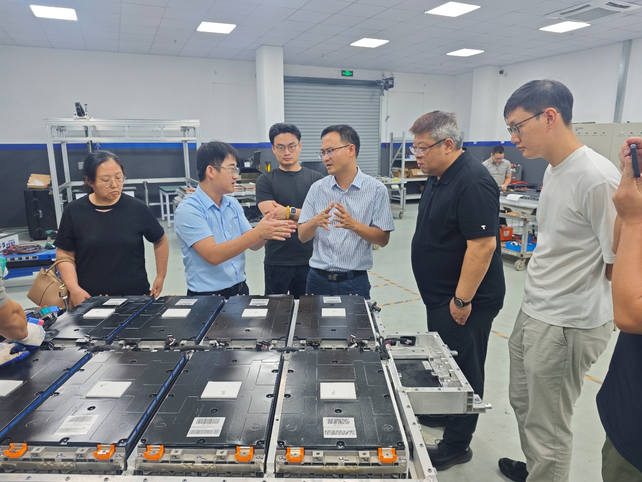 图1 企业车间参观与交流 在企业负责人陪同下,调研团队深入车间,实地参观了宁德时代旗下“后市场宁家服务”维保体系,调研团队认真观摩学习了新能源动力电池从回收、检测、更换到处理的全流程标准化作业,对宁德时代构建的电池全生命周期服务生态,及其在电池安全、梯次利用与环保回收等领域的领先技术实力令人印象深刻。
