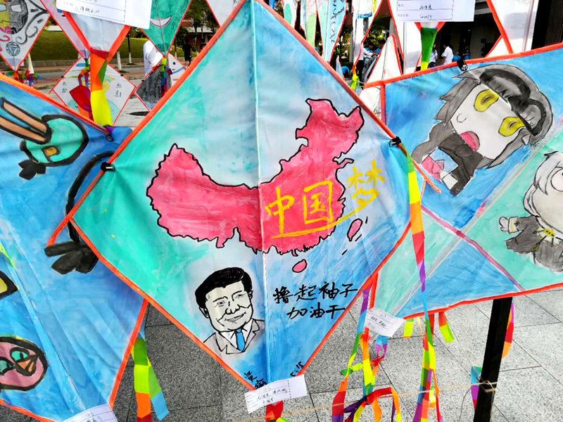 在主持人宣布比赛开始后,参赛者们便开始了他们精彩的创作,他们用丰富的色彩,巧妙的构图,不同的绘画风格,在空白的风筝中彩绘自己的创意。他们一边发挥自己的想象力,一边运用手中的画笔在空白的风筝上一笔一划作画。有如“中国梦”作品,在风筝上勾勒出中国的基本轮廓,并且把习近平总书记的人像也画上去,附上“撸起袖子加油干”,可见这个组合对中国寄予了美好的希望,同时激励青年们勇敢肩负时代赋予的重任;有如“咏梅”作品,一支小小的画笔沾上彩色的颜料,一点一墨,一枝梅花就呈现在了空白风筝上,给人以立志奋发的激励;有如“一家人”作品,结合现社会流行的小猪佩奇一家人,反映了一家人最重要的就是整整齐齐……历经两个小时的创作后,参赛者将自己的作品交至作品投票展览处登记信息并展览。