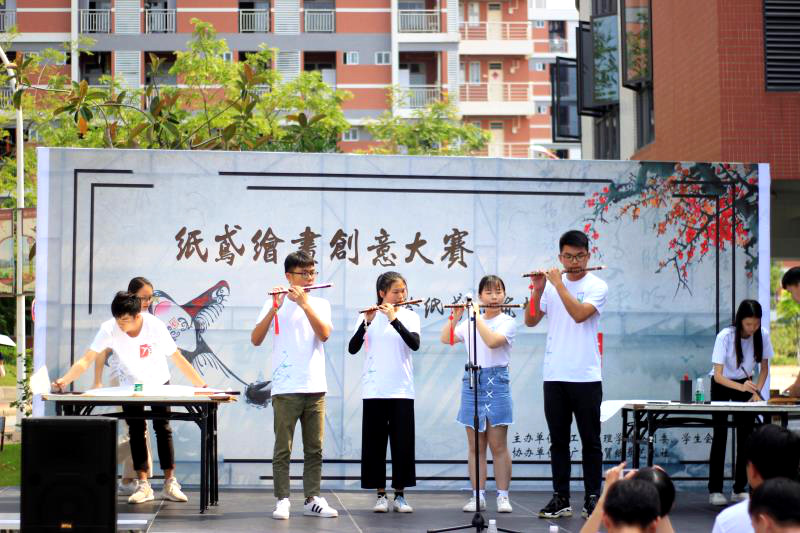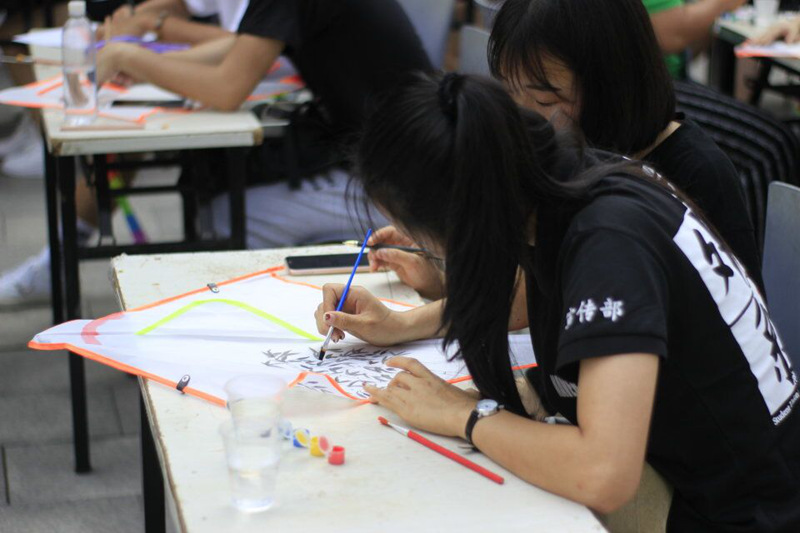 烈日炎炎的下午,阻挡不了纸鸢绘画创意大赛参赛者的热情,许多参赛者都提前来到了活动现场。在开幕式上,伴随着竹乐轩旋律悠扬、曲声绵长的萧乐伴奏,书法表演者凝神定气站在桌前,宣纸上的墨字一气呵成,一笔一划但见其功力,遒劲有力。随后礼仪部为我们展示了许许多多风格迥异的纸鸢作品。