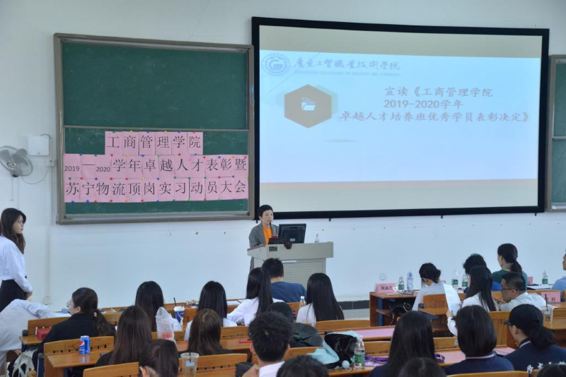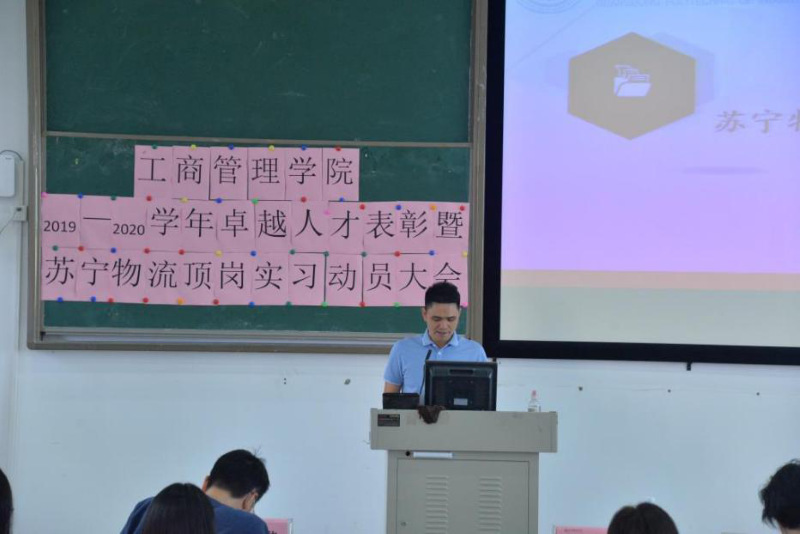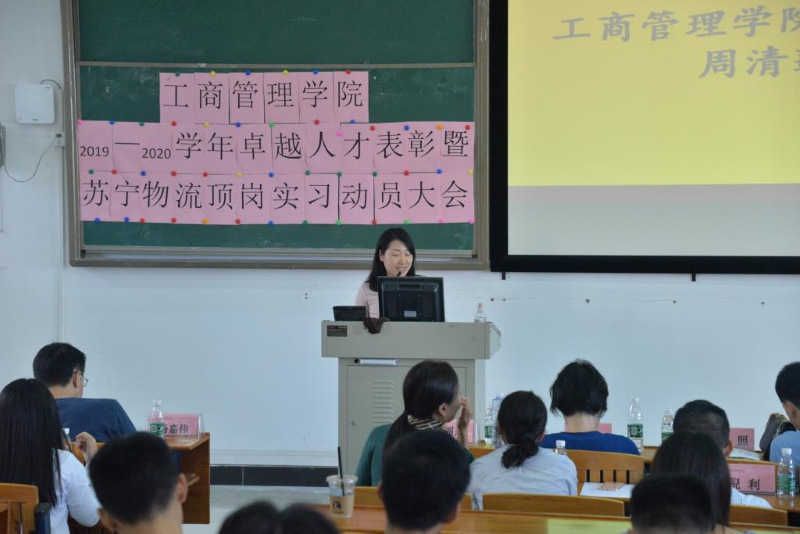 20201027日下午,工商管理学院在明德楼2-305召开了2019-2020学年卓越人才表彰暨苏宁物流顶岗实习动员大会。工商管理学院党总支书记周清莲、副书记谢宏祥、副院长倪春丽、专任教师、辅导员及1819级商管专业180多名学生共同参加了会议。