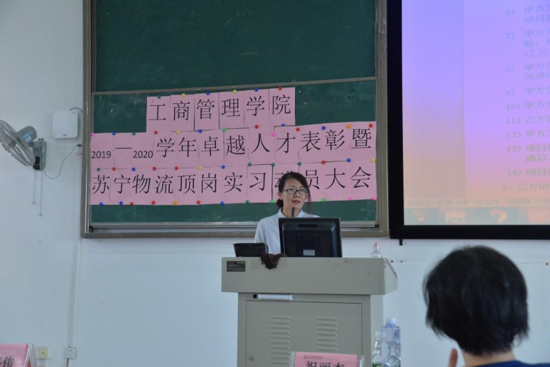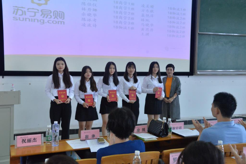 会上,首先进行颁奖仪式,倪春丽、谢宏祥分别宣读了2019-2020卓越人才培养班优秀学员和2019-2020苏宁物流“优秀专项顶岗实习生”的表彰决定并进行了颁奖。